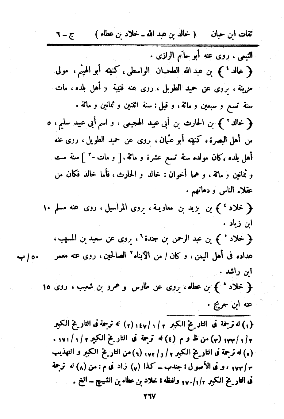 7671 - خَالِد بن عبد الله الطَّحَّان الوَاسِطِيّ كنيته أَبُو الْهَيْثَم مولى مزينة يروي عَن حميد الطَّوِيل روى عَنهُ قُتَيْبَة وَأهل بَلَده مَاتَ سنة تسع وَسبعين وَمِائَة وَقيل سنة اثْنَتَيْنِ وَثَمَانِينَ وَمِائَة