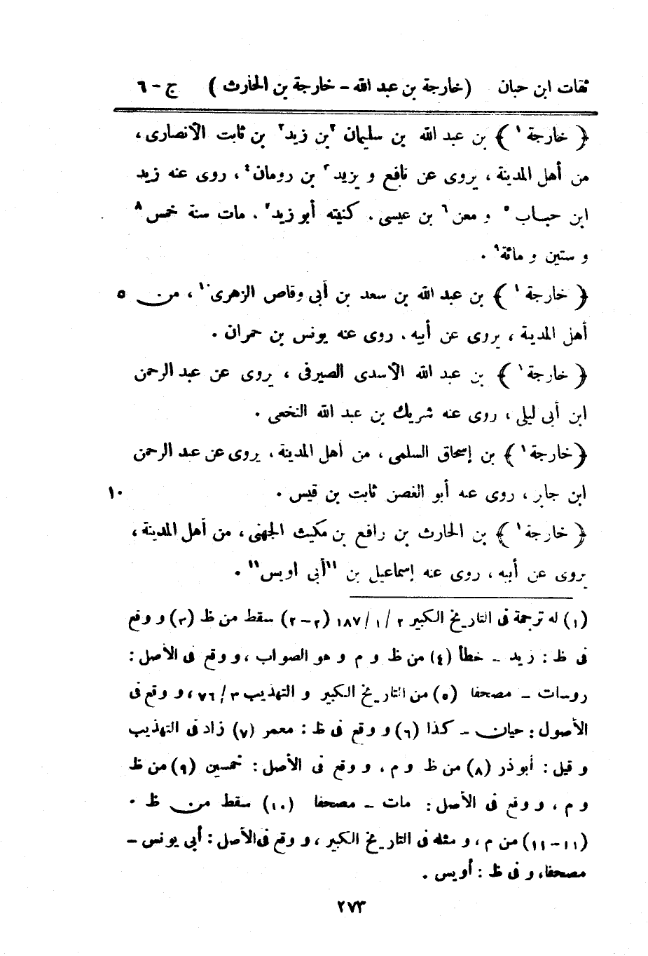 7700 - خَارِجَة بن عبد الله بن سُلَيْمَان بْن زيد بْن ثَابت الْأنْصَارِيّ من أهل الْمَدِينَة يروي عَن نَافِع وَيزِيد بن رُومَان رَوَى عَنْهُ زيد بْن حباب ومعن بن عِيسَى كنيته أَبُو زيد مَاتَ سنة خمس وَسِتِّينَ وَمِائَة