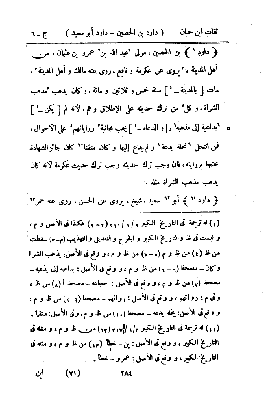 7748 - دَاوُد بن الْحصين مولى عبد اللَّه بن عَمْرو بْن عُثْمَان من أهل الْمَدِينَة يروي عَن عِكْرِمَة وَنَافِع روى عَنهُ مَالك وَأهل الْمَدِينَة مَاتَ بِالْمَدِينَةِ سنة خمس وَثَلَاثِينَ وَمِائَة وَكَانَ يذهب مَذْهَب الشراة وكل من ترك حَدِيثه على الْإِطْلَاق وهم لِأَنَّهُ لم يكن بداعية إِلَى مذْهبه والدعاة يجب مجانبة رواياتهم على الْأَحْوَال فَمن انتحل نحلة بِدعَة وَلم يدع إِلَيْهَا وَكَانَ متقنا كَانَ جَائِز الشَّهَادَة محتجا بروايته فَإِن وَجب ترك حَدِيثه وَجب ترك حَدِيث عِكْرِمَة لِأَنَّهُ كَانَ يذهب مَذْهَب الشراة مثله