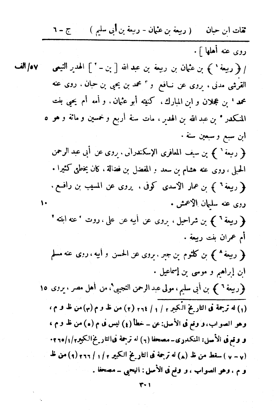 7817 - ربيعَة بن عُثْمَان بن ربيعَة بن عبد الله بن الهدير التَّيْمِيّ الْقرشِي مدنِي يروي عَن نَافِع وَمُحَمّد بن يحيى بن حبَان روى عَنهُ مُحَمَّد بن عجلَان وَابْن الْمُبَارك كنيته أَبُو عُثْمَان وَأمه أم يحيى بنت الْمُنْكَدر بن عبد الله بن الهدير مَاتَ سنة أَربع وَخمسين وَمِائَة وَهُوَ بن سبع وَسبعين سنة