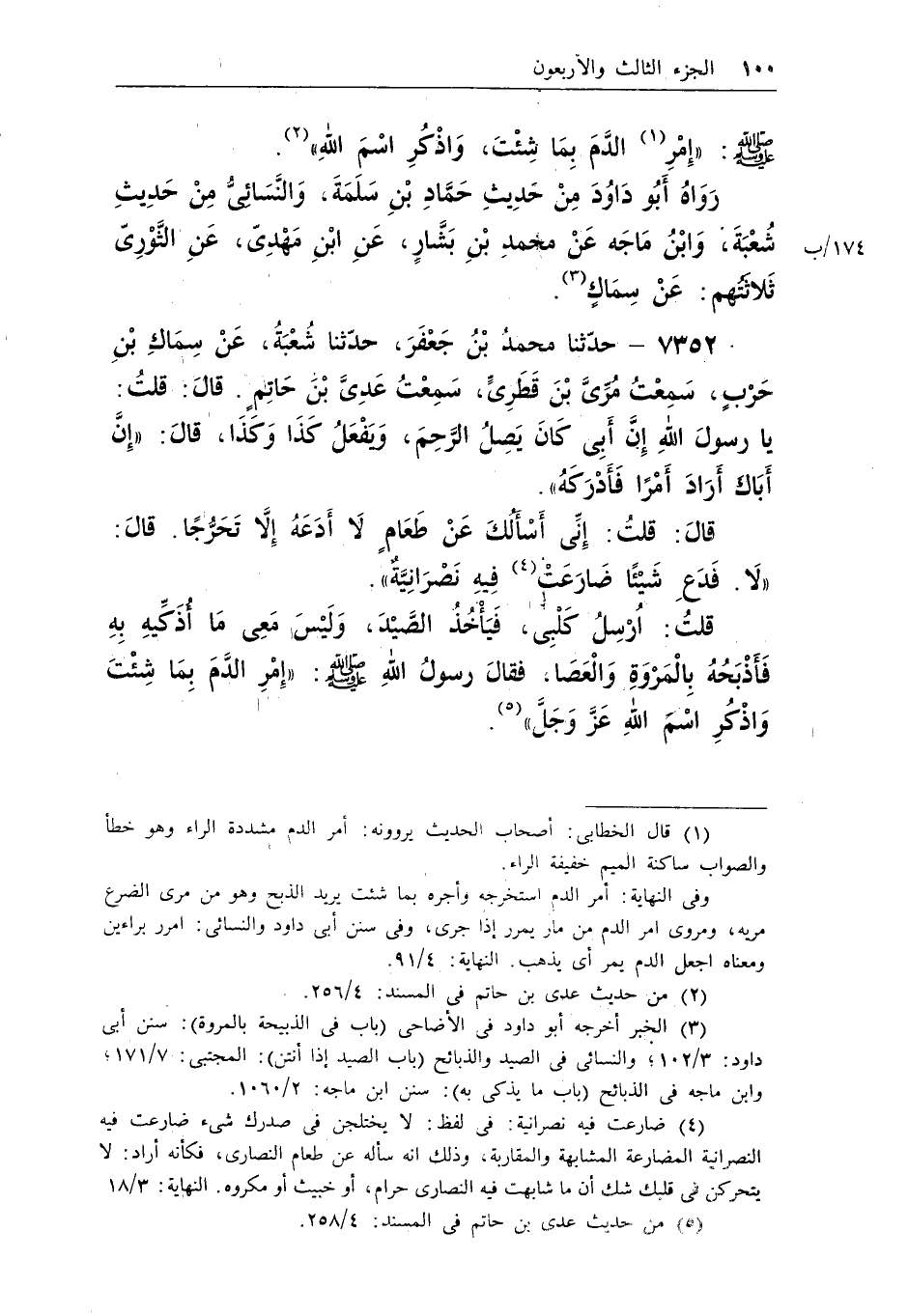 (¬3) الخبر أخرجه أبو داود فى الأضاحى (باب فى الذبيحة بالمروة) : سنن أبى داود: 3/102؛ والنسائى فى الصيد والذبائح (باب الصيد إذا أنتن) : المجتبى: 7/171؛ وابن ماجه فى الذبائح (باب ما يذكى به) : سنن ابن ماجه: 2/1060.
