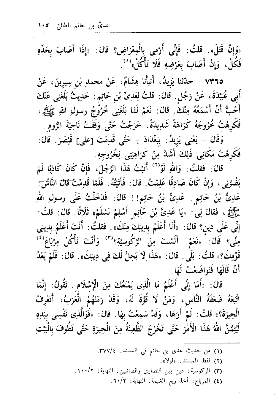7365 - حدثنا يزيد، أنبأنا هشام، عن محمد بن سيرين، عن أبى عبيدة، عن رجل. قال: قلت لعدى بن حاتم: حديث عنك أحب أن أسمعه منك. قال: نعم لما بلغنى خروج رسول الله - صلى الله عليه وسلم - فكرهت خروجه كراهة شديدة، خرجت حتى وقفت ناحية الروم.