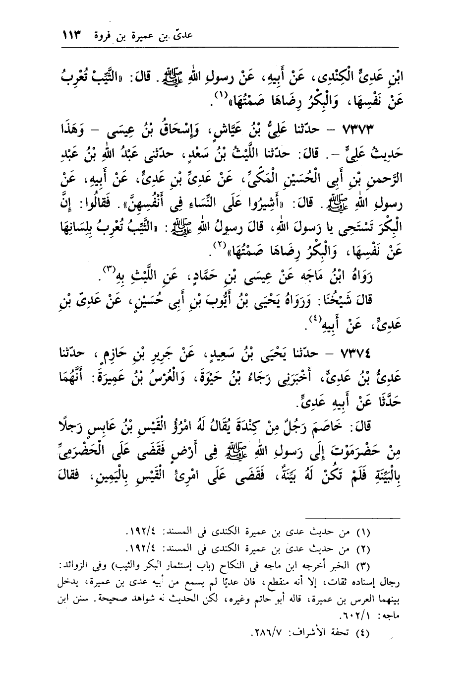 ابن عدى الكندى، عن أبيه عن رسول الله - صلى الله عليه وسلم -. قال «الثَّيِّبْ تُعْرِبُ عَنْ نَفْسِهَا، وَالْبِكْرُ رِضَاهَا صَمْتُهَا» (¬1) .