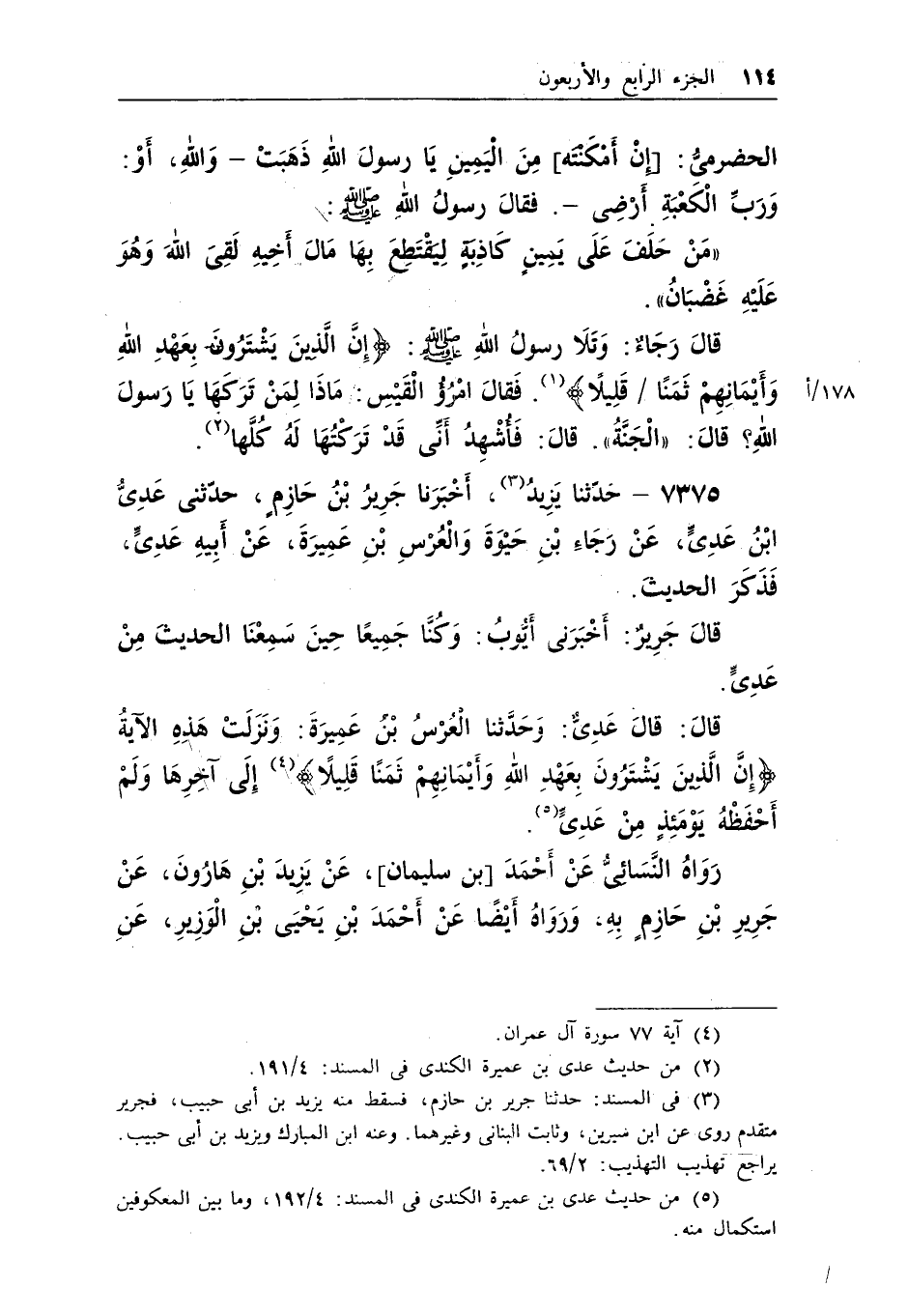 قال: قال عدى: وحدثنا العرس بن عميرة: ونزلت هذه الآية (إِنَّ الَّذِينَ يَشْتَرُونَ بِعَهْدِ اللَّهِ وَأَيْمَانِهِمْ ثَمَناً قَلِيلاً) إلى آخرها ولم أحفظه يومئذ من عدى (¬2) .