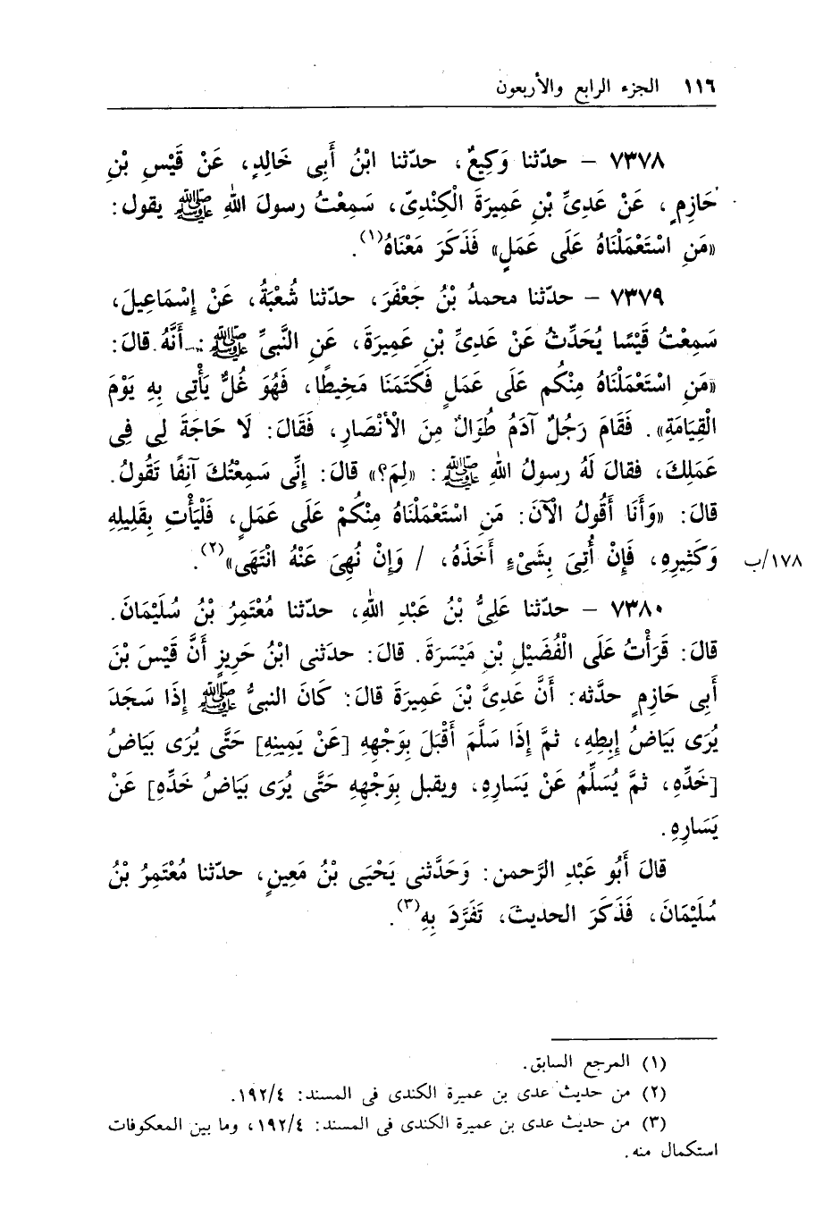 7378 - حدثنا وكيع، حدثنا ابن أبى خالد، عن قيس بن حازم، عن عدى ابن عميرة الكندى، سمعت رسول الله - صلى الله عليه وسلم - يقول: «مَنْ اسْتَعْمَلْنَاهُ عَلَى عَمَلٍ» فذكر معناه (¬1) .