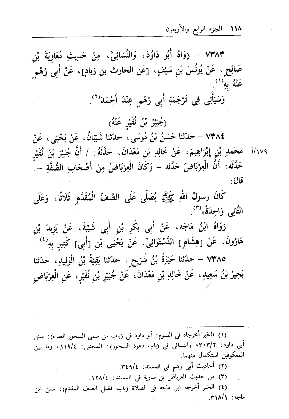 7384 - حدثنا حسن بن موسى، حدثنا شيبان، عن يحيى، عن محمد بن إبراهيم، عن خالد بن معدان، حدثه: / أن جبير بن نفير حدثه: أن العرباض حدثه- وكان العرباض من أصحاب الصفة-. قال: