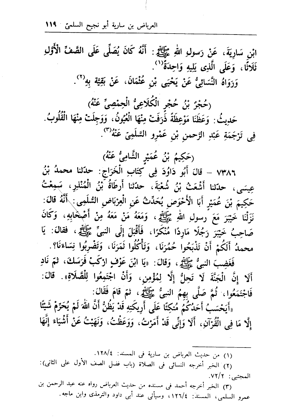 (¬3) الخبر أخرجه أحمد فى مسنده من حديث العرباض رواه عنه عبد الرحمن بن عمرو السلمى، المسند: 4/126، وسيأتى عند أبى داود والترمذى وابن ماجه.