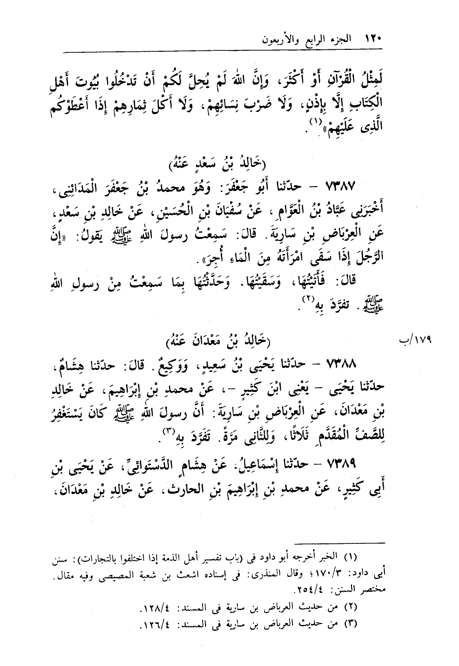 7388 - حدثنا يحيى بن سعيد، ووكيع. قال: حدثنا هشام، حدثنا يحيى- يعنى ابن كثير-، عن محمد بن إبراهيم، عن خالد بن معدان، عن العرباض بن سارية: أن رسول الله - صلى الله عليه وسلم - كان يستغفر للصف المقدم ثلاثا، وللثانى مرة. تفرد به (¬2) .