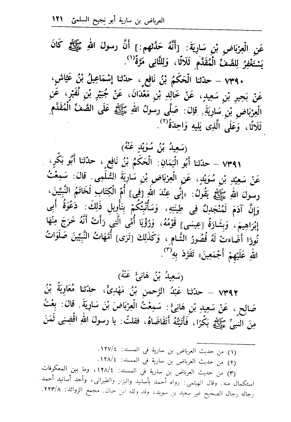 7390 - حدثنا الحكم بن نافع، حدثنا إسماعيل بن عياش، عن بحير بن سعيد، عن خالد بن معدان، عن جبير بن نفير، عن العرباض بن سارية. قال: رسول الله - صلى الله عليه وسلم - على الصف المقدم ثلاثا، وعلى الذى يليه واحدة (¬1) .