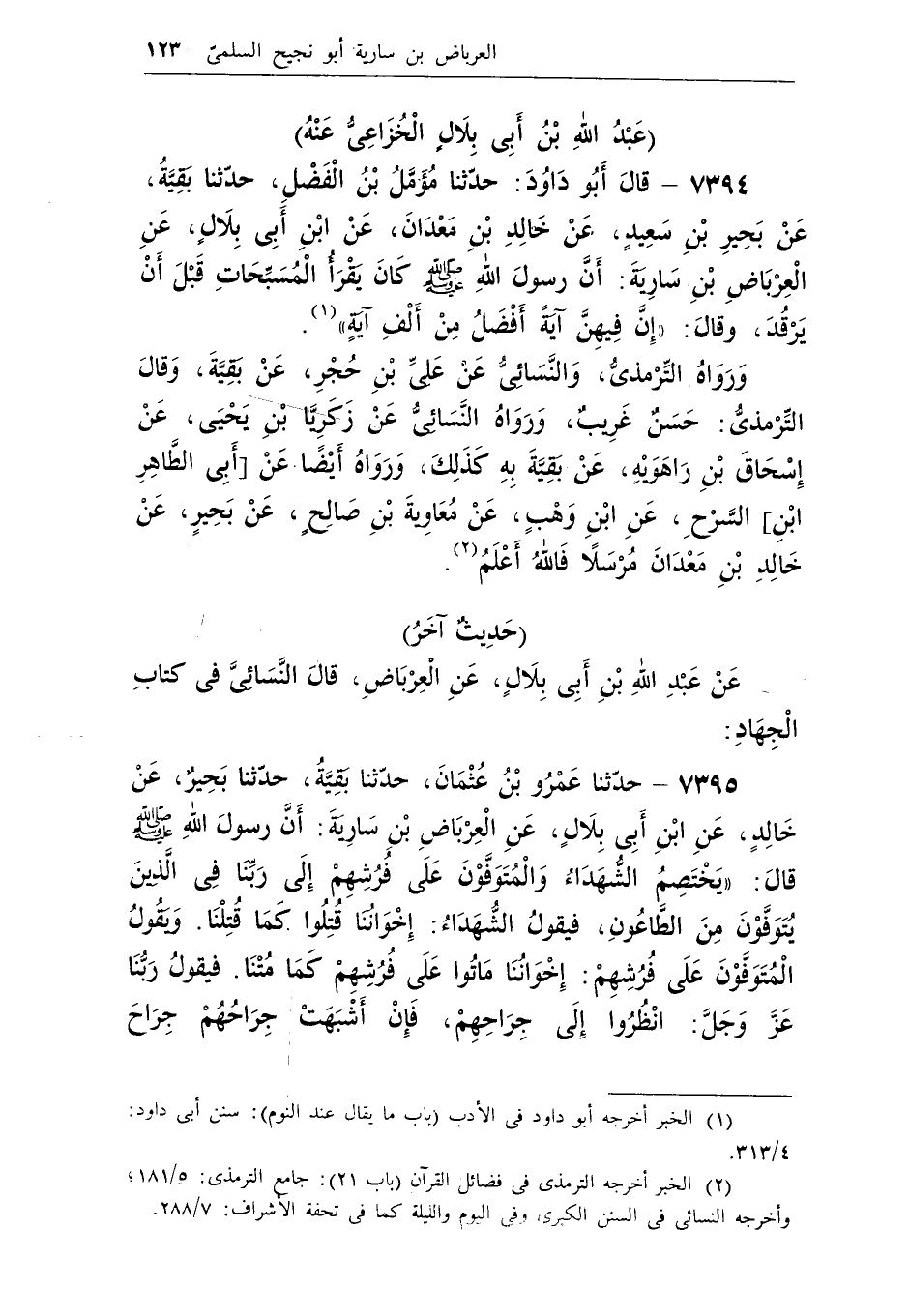 ورواه الترمذى، والنسائى عن على بن حجر، عن بقية، وقال الترمذى: حسن غريب، ورواه النسائى عن زكريا بن يحيى، عن إسحاق بن راهويه، عن بقية به كذلك، ورواه أيضاً عن [أبى الطاهر ابن] السرح، عن ابن وهب، عن معاوية بن صالح، عن بحير، عن خالد بن معدان مرسلا فالله أعلم (¬2) .