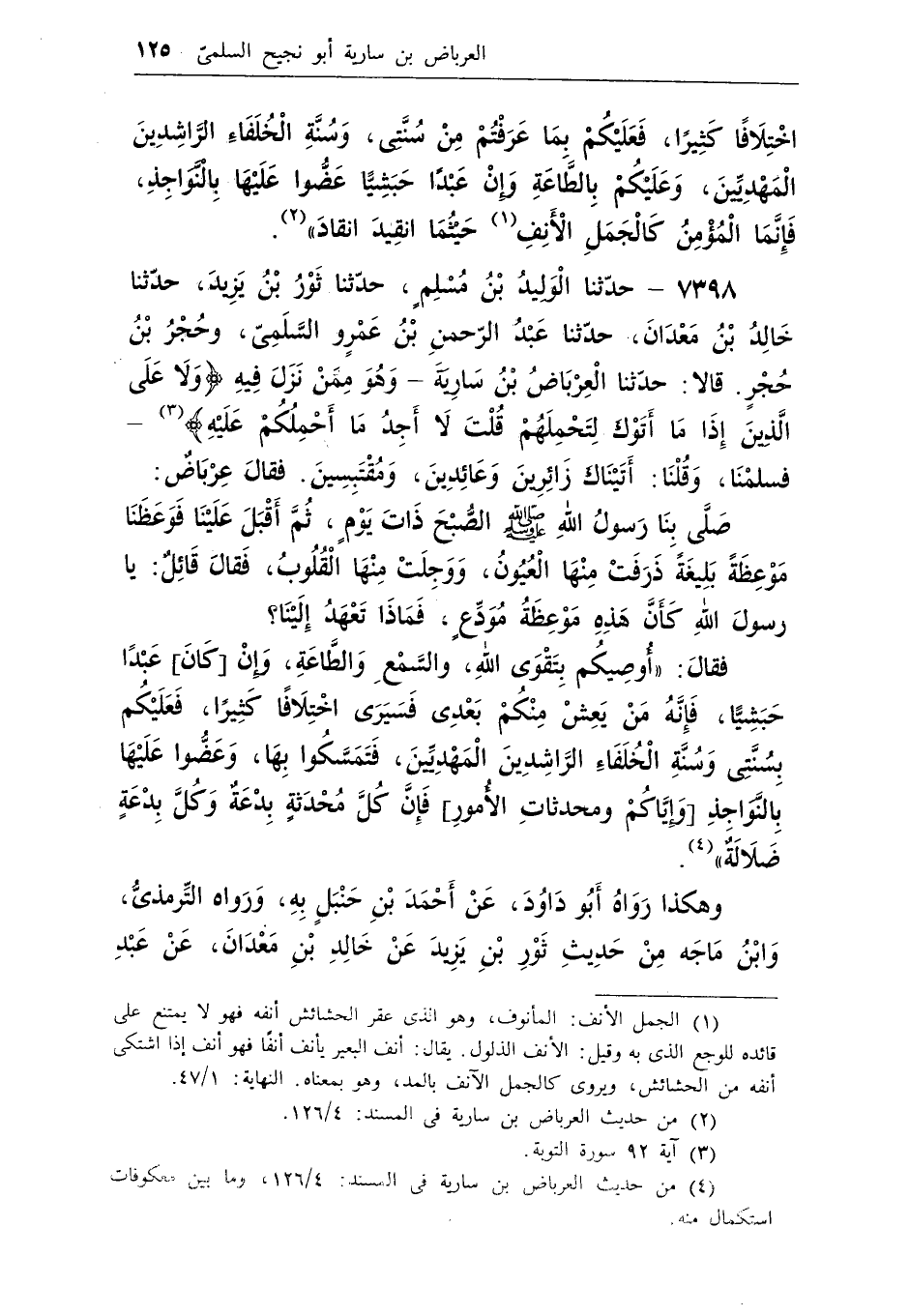 (¬4) من حديث العرباض بن سارية فى المسند: 4/126، وما بين معكوفات استكمال منه.