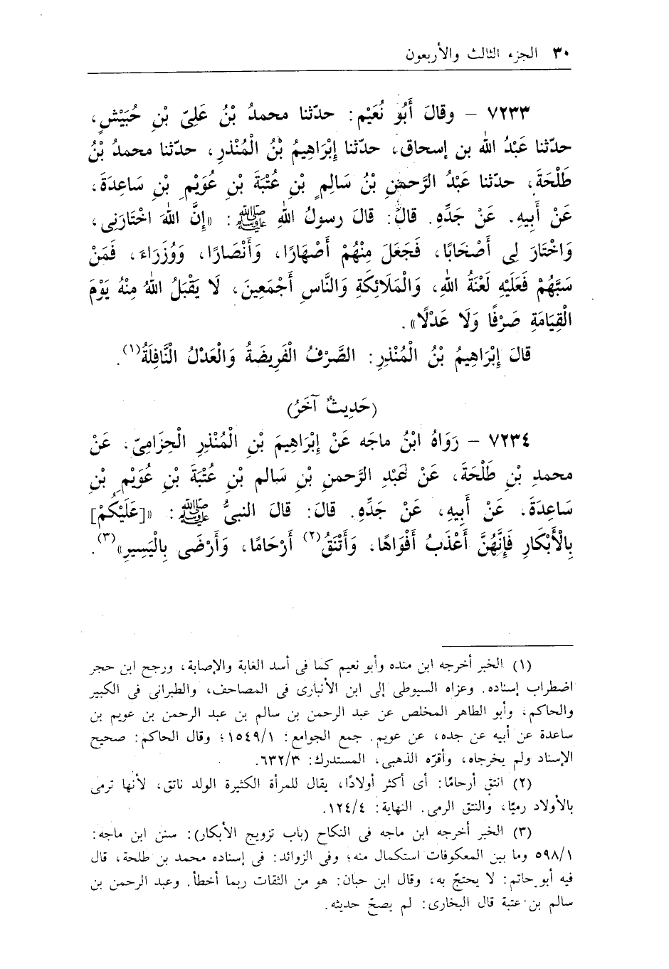 7233 - وقال أبو نعيم: حدثنا محمد بن على بن حبيش، حدثنا عبد الله ابن إسحاق، حدثنا إبراهيم بن المنذر، حدثنا محمد بن طلحة، حدثنا عبد الرحمن ابن سالم ابن عتبة بن عويم بن ساعدة، عن أبيه، عن جده قال: قال رسول الله - صلى الله عليه وسلم -: «إِنَّ اللهَ اخْتَارَنِى، وَاخْتَارَ لِى أََصَحَاباً، فَجَعلَ مِنْهُمْ أَصْهَاراً، وَأَنْصَاراً، وَوُزراءَ، فَمَنْ سَبْهُمْ فَعَلَيْه لعْنَةُ اللهِ، وَالْمَلاَئِكةِ وَالْنَاسِ أَجْمَعِينَ، لاَ يَقْبَلُ اللهُ مَنْهُ يَوْمَ القِيَامَةِ صَرْفاً وَلاَ عَدلاً» .