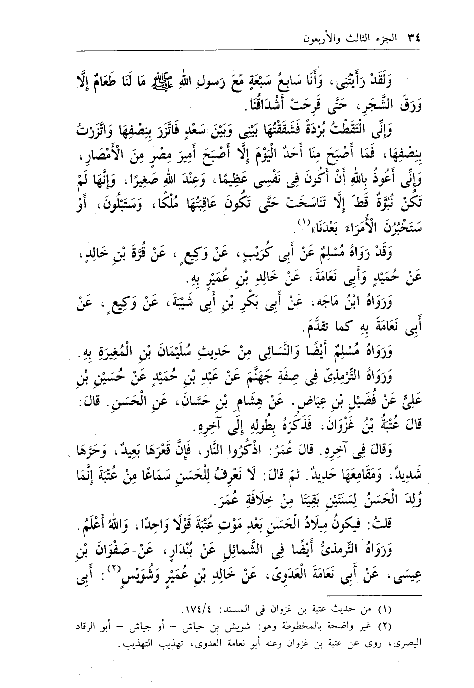 وقال فى آخره. قال عمرو: اذكروا النار، فإن قعرها بعيد، وحرها شديد، ومقامعها حديد. ثم قال: لا تعرف للحسن سماعاً من عتبة إنما ولد الحسن لسنتين بقيتا من خلافه عمر.