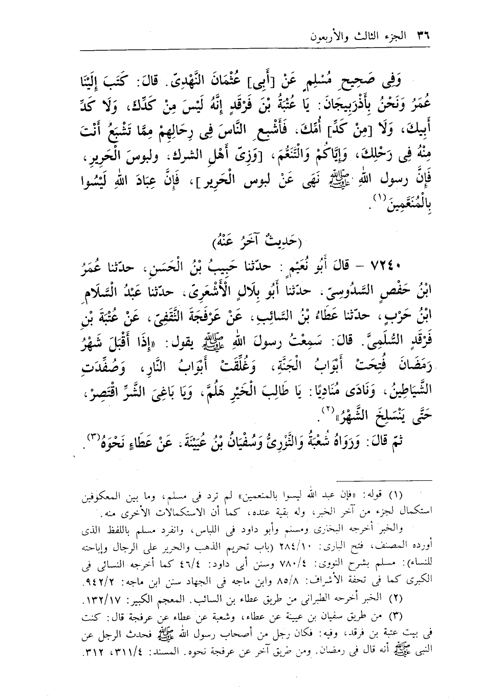 (¬2) من طريق سفيان بن عتبة عن عطاء، وشعبة عن عطاء عن عرفجة قال: كنت فى بيت عتبة بن فرقد، وفيه: فكان رجل من أصحاب رسول الله - صلى الله عليه وسلم - فحدث الرجل عن النبى - صلى الله عليه وسلم - أنه قال فى رمضان. ومن طريق آخر عن عرفجة نحوه. المسند: 4/311، 312.
