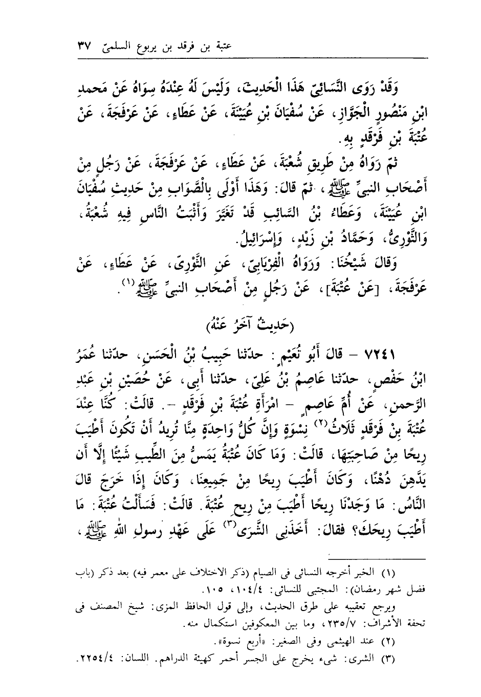وقد روى النسائى هذا الحديث، وليس له عنده سواه عن محمد ابن منصور الجواز، ن سفيان بن عيينة، عن عطاء، عن عرفجة، عن عتبة بن فرقد به.