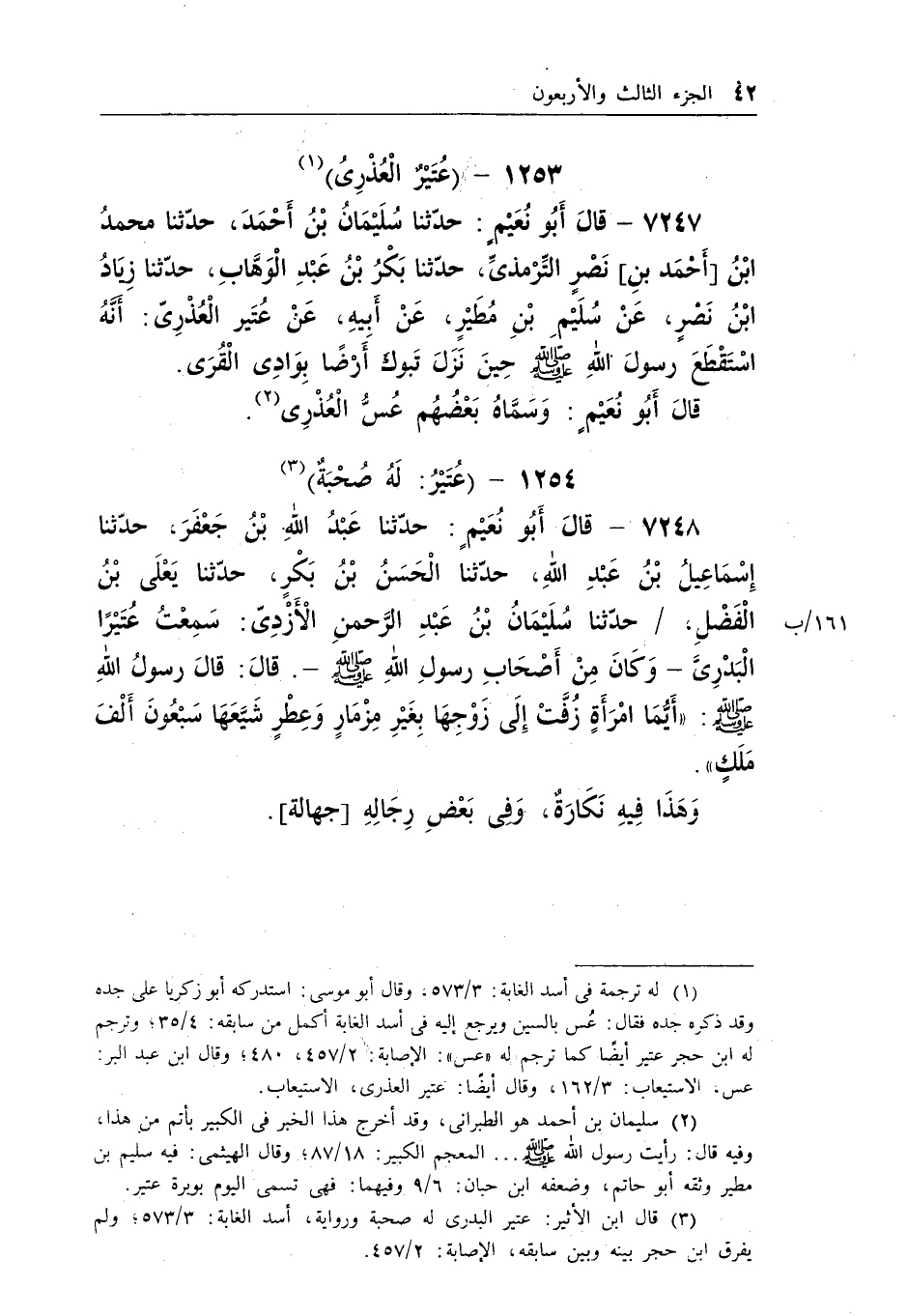 (¬3) قال ابن الأثير: عتير البدرى له صحبة ورواية، أسد الغابة: 3/573؛ ولم يفرق ابن حجر بينه وبين سابقه، الإصابة: 2/457.