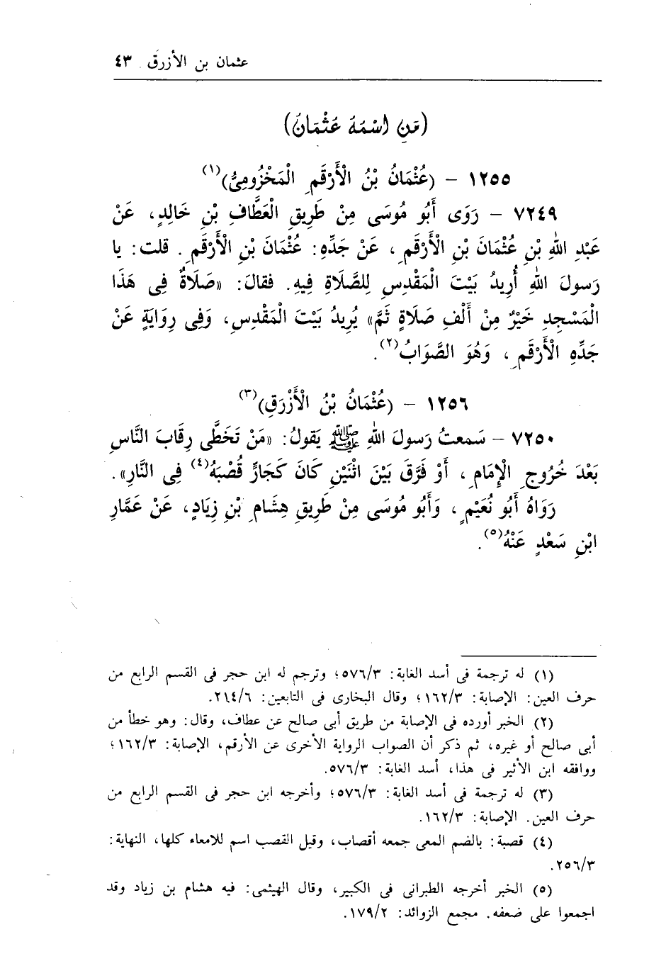7249 - روى أبو موسى من طريق العطاف بن خالد، عن عبد الله بن عثمان بن الأرقم، عن جده: عثمان بن الأرقم. قلت: يا رسول الله أريد بيت المقدس للصلاة فيه. فقال: «صلاة فى هذا المسجد خير من ألف صلاة ثم» يريد بيت المقدس، وفى رواية عن جده الأرقم، وهو الصواب (¬2) .