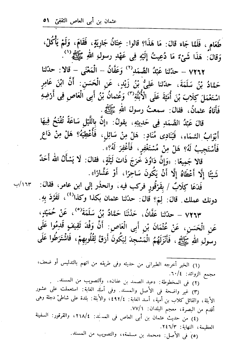 7263 - حدثنا عفان، حدثنا حماد بن سلمة (¬4) عن حميد عن الحسن، عن عثمان بن أبى العاص: أن وفد ثقيف قدموا على رسول الله - صلى الله عليه وسلم -، فأنزلهم المسجد ليكون أرق لقلوبهم، فاشترطوا على