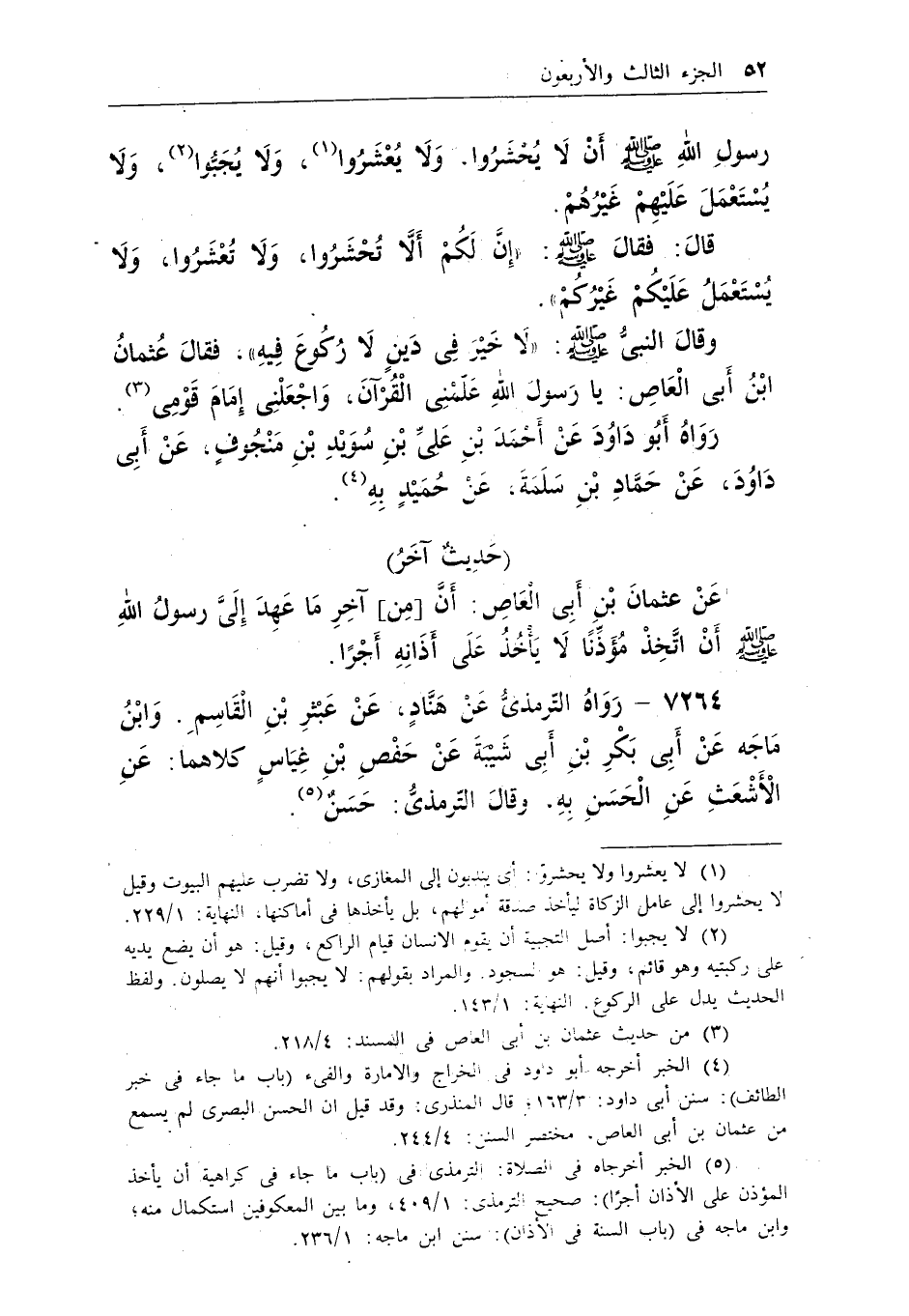 (¬4) الخبر أخرجه أبو داود فى الخراج والامارة والفىء (باب ما جاء فى خبر الطائف) : سنن أبى داود: 3/163؛ قال المنذرى: وقد قيل أن الحسن البصرى لم يسمع من عثمان بن أبى العاص. مختصر السنن: 4/244.