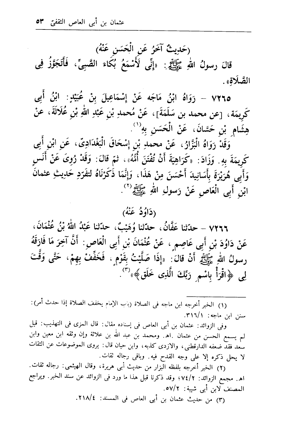 7266 - حدثنا عفان، حدثنا وهيب، حدثنا عبد الله بن عثمان، عن داود ابن أبى عاصم، عن عثمان بن أبى العاص: أن آخر ما فارقه رسول الله - صلى الله عليه وسلم - أن قال: إَذا صَلَّيْتُ بِقَوْمٍ، فَخَفَّفْ بِهِم، حَتَّى وَقَّتَ لِى (اقْرَأْ بِاسْم رَبَّكَ الَّذِى خَلَق) (¬2)