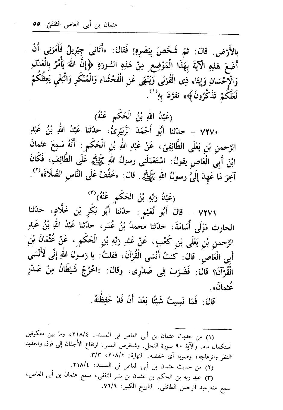 7271 - قال أبو نعيم: حدثنا أبو بكر بن خلاد، حدثنا الحارث مولى أسامة، حدثنا محمد بن عمر، حدثنا عبد الله بن عبد الرحمن بن يعلى بن كعب، عن عبد ربه بن الحكم، عن عثمان بن أبى العاص. قال: كنت أنسى القرآن، فقلت يا رسول الله إنى لأنسى القرآن؟ قال: فضرب فى صدرى، وقال: «اخْرُجْ شَيْطَانُ مِنْ صَدْرِ عُثمانَ» .