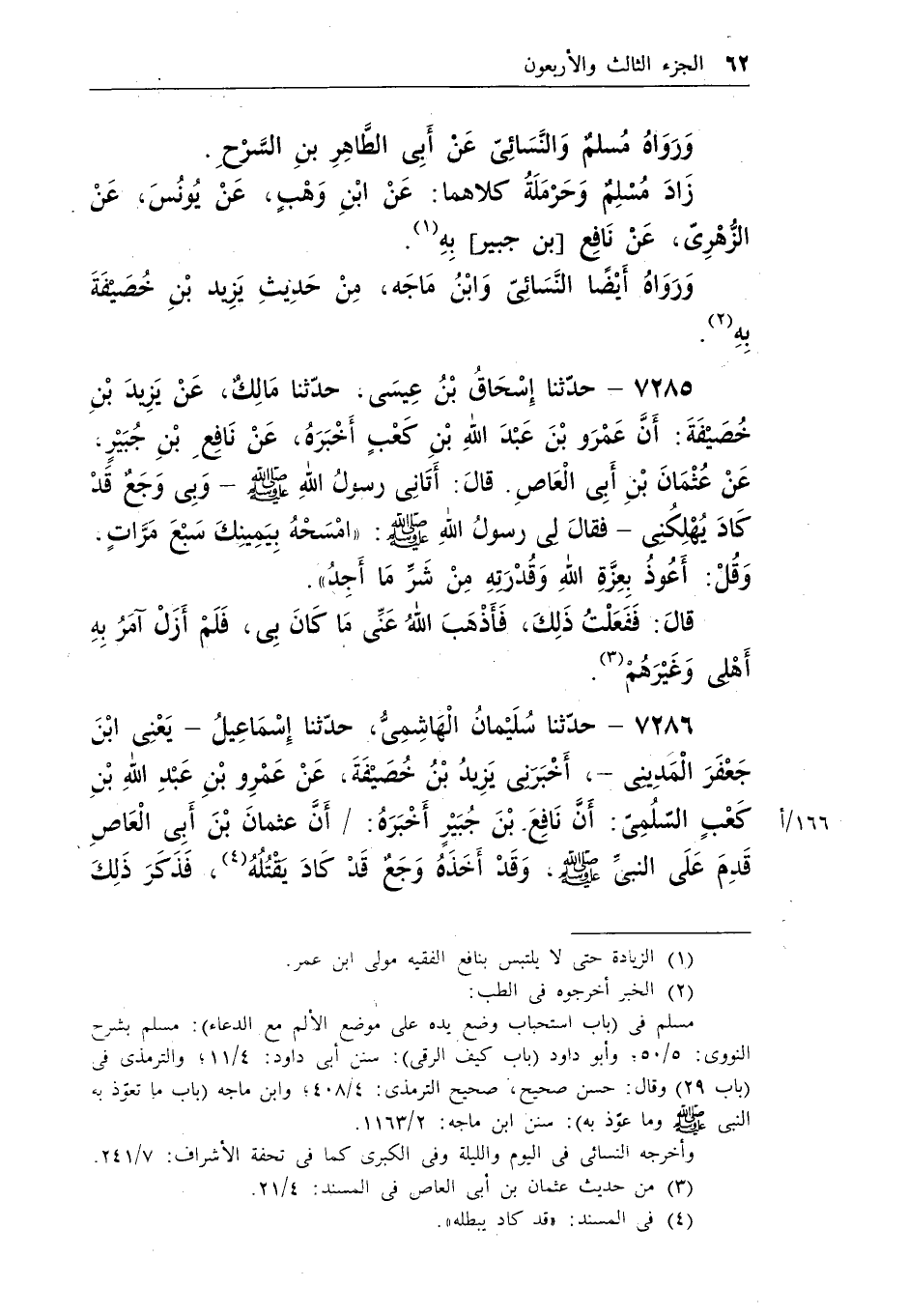 7286 - حدثنا سليمان الهاشمى، حدثنا إسماعيل- يعنى ابن جعفر المدينى-، أخبرنى يزيد بن خصيفة، عن عمرو بن عبد الله بن كعب السلمى: أن نافع بن جبير أخبره: / أن عثمان بن أبى العاص قدم على النبى - صلى الله عليه وسلم -، وقد أخذه وجع قد كاد يقتله (¬2) ، فذكر ذلك