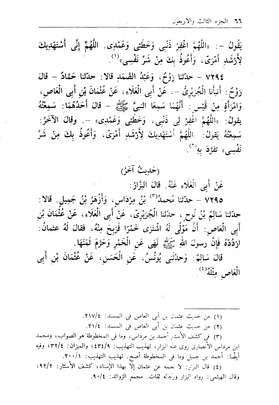 7294 - حدثنا روح، وعبد الصمد قالا: حدثنا حماد- قال روح: أنبأنا الجريرى-، عن أبى العلاء، عن عثمان بن أبى العاص، وامرأة من قيس: أنهما سمعنا النبى - صلى الله عليه وسلم - قال أحدهما: سمعته يقول: «اللَّهُمَّ اغْفِرْ لِى ذَنْبِى، وَخّطَئِى وَعَمْدِى» -. وقال الآخر: سمعته يقول: اللَّهُمَّ أَسْتَهْدِيكَ لِأَرْشَدِ أَمْرَىّ، وَأَعُوذُ بِكَ مِنْ شَرَّ نَفِسى» . تفرد به (¬2) .