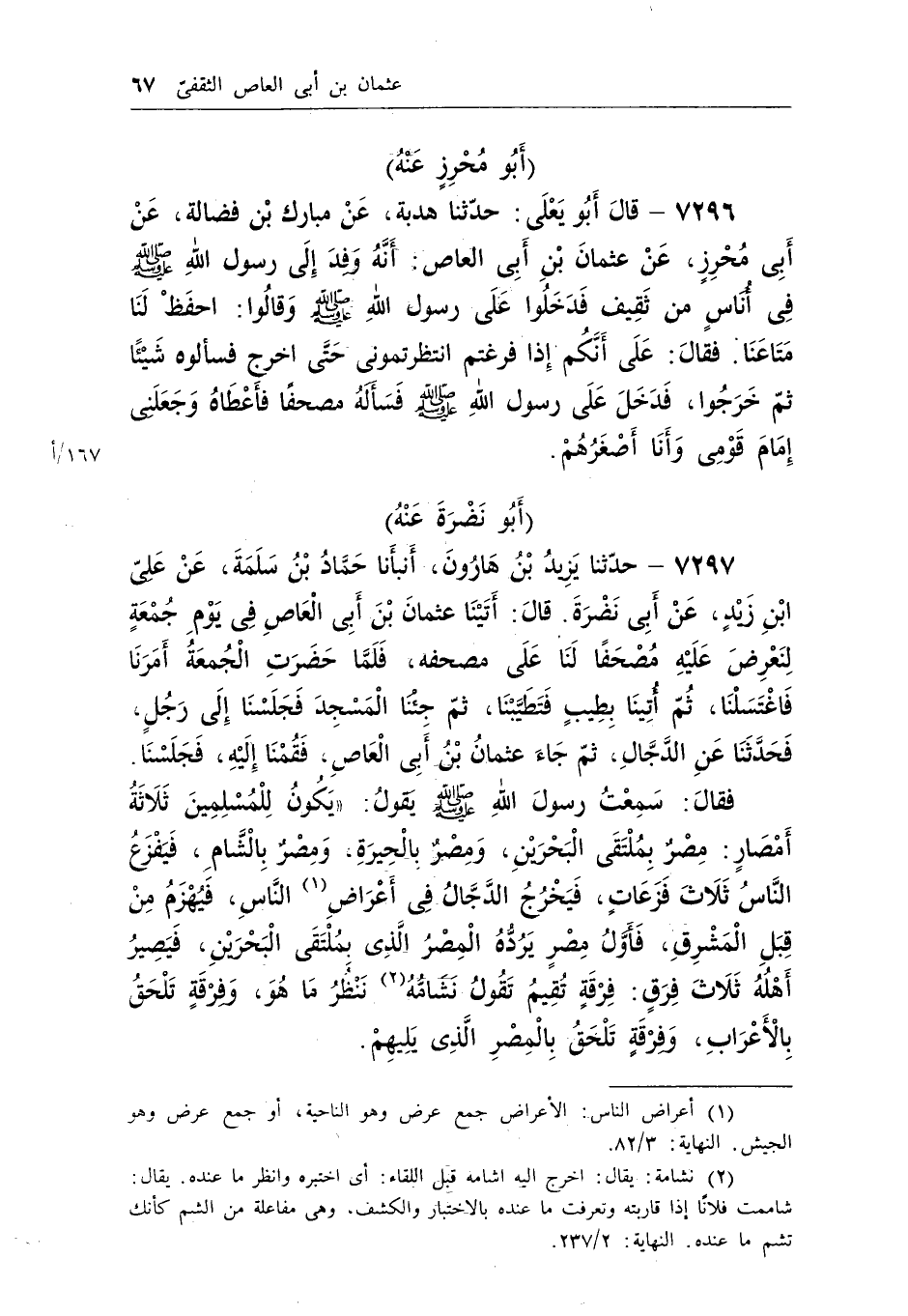 7297 - حدثنا يزيد بن هارون، أنبأنا حماد بن سلمة، عن على ابن زيد، عن أبى نضرة. قال: أتينا عثمان بن أبى العاص فى يوم جمعة لنعرض عليه مصحفاً لنا على مصحفه، فلما حضرت الجمعة أمرنا فاغتسلنا، ثم أتينا بطيب فتطيبنا، ثم جئنا المسجد فجلسنا إلى رجل، فحدثنا عن الدجال، ثم جاء عثمان بن أبى العاص، فقمنا إليه، فجلسنا.