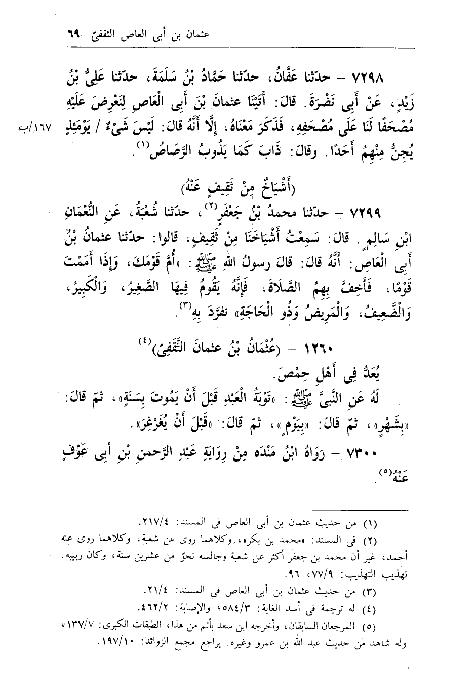 7298 - حدثنا عفان، حدثنا حماد بن سلمة، حدثنا على بن زيد، عن أبى نضرة. قال: أتينا عثمان بن أبى العاص لنعرض مصحفاً لنا على مصحفه، فذكر معناه، إلا أنه قال: ليس شىء/ يومئذ يجن منهم أحداً. وقال: ذاب كما يذوب الرصاص (¬1)