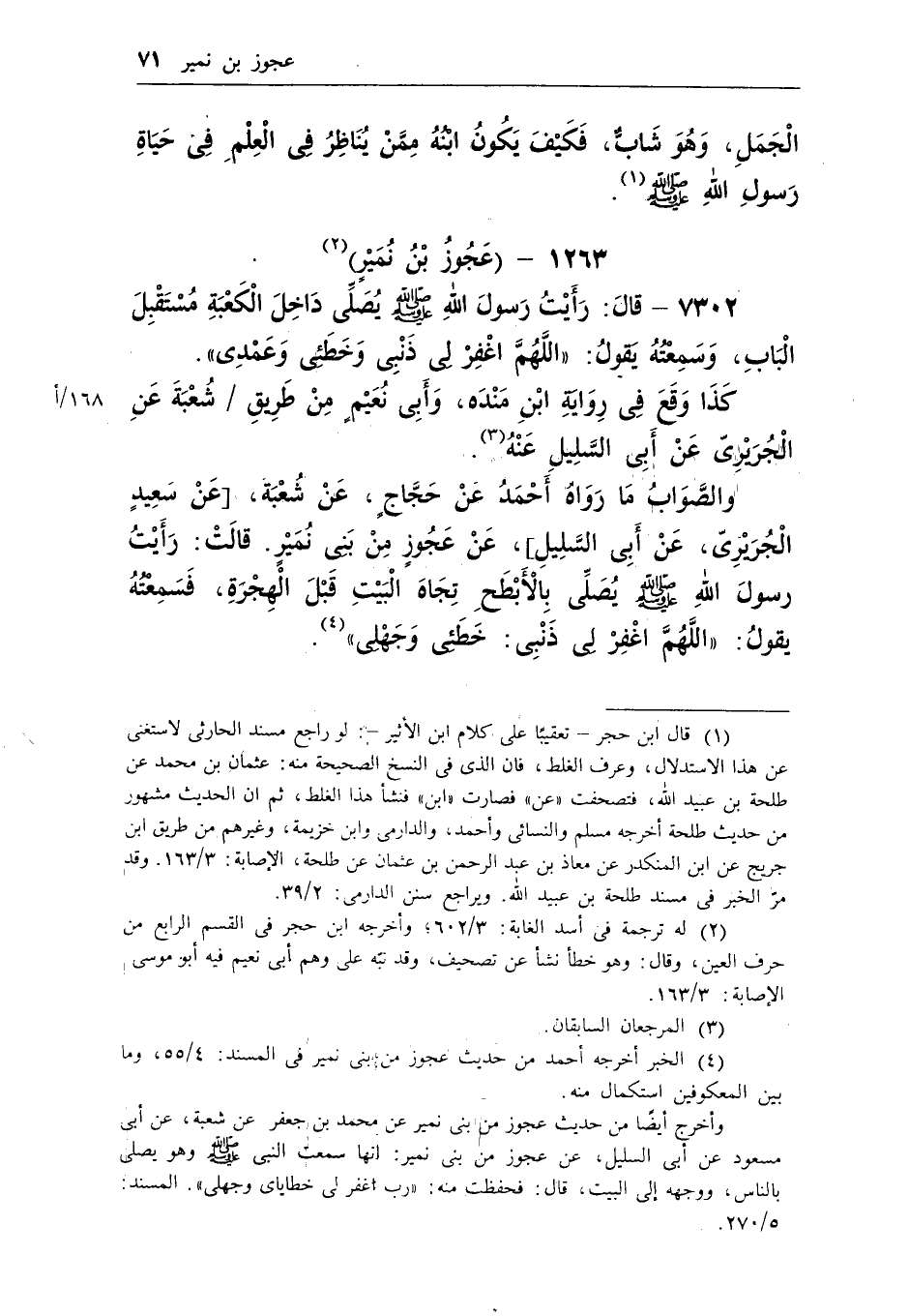 وأخرج أيضاً من حديث عجوز من بنى نمير عن محمد بن جعفر عن شعبة، عن أبى مسعود عن أبى السليل، عن عجوز من بنى نمير: إنها سمعت رسول الله - صلى الله عليه وسلم - وهو يصلى بالناس، ووجهه إلى البيت، قال: فحفظت منه: «رب اغفر لى خطاياى وجهلى» . المسند: 5/270.