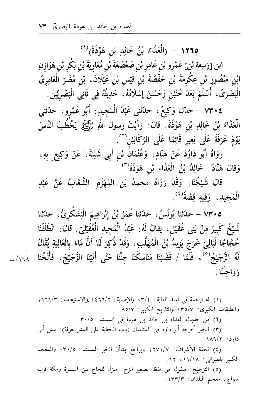 7304 - حدثنا وكيع، حدثنى عبد المجيد، أبو عمرو، حدثنى العداء بن خالد بن هوذة. قال: رأيت رسول الله - صلى الله عليه وسلم - يخطب الناس يوم عرفة على بعير قائما على الركابين (¬2) .