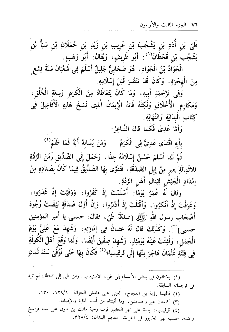 (¬1) يختلفون فى بعض الأسماء إلى طى، الاستيعاب. ومن طى إلى قحطان لم ترد فى ترجماته السابقة.