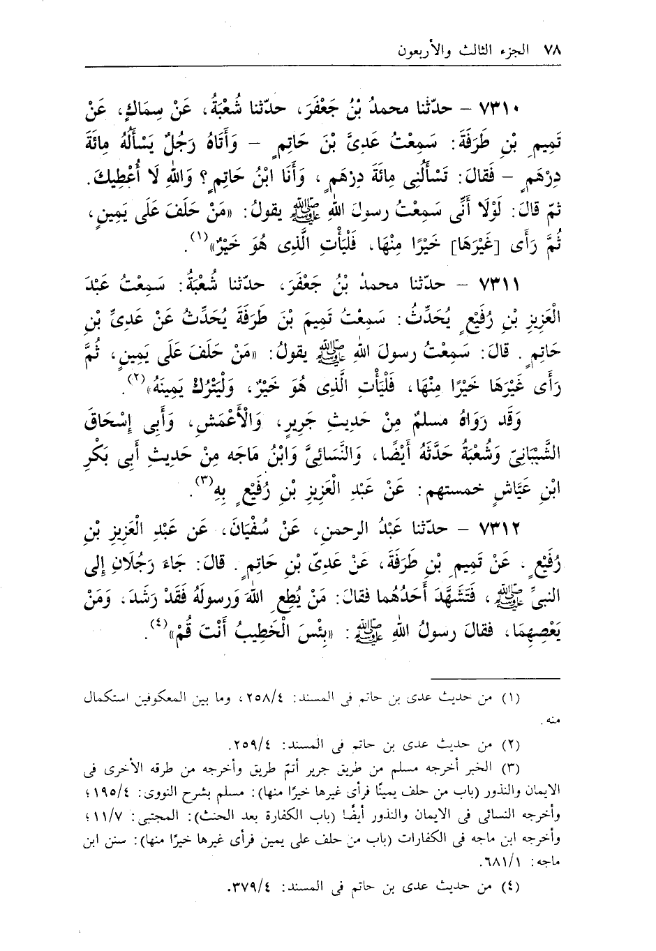 (¬4) من حديث عدى بن حاتم فى المسند: 4/379.