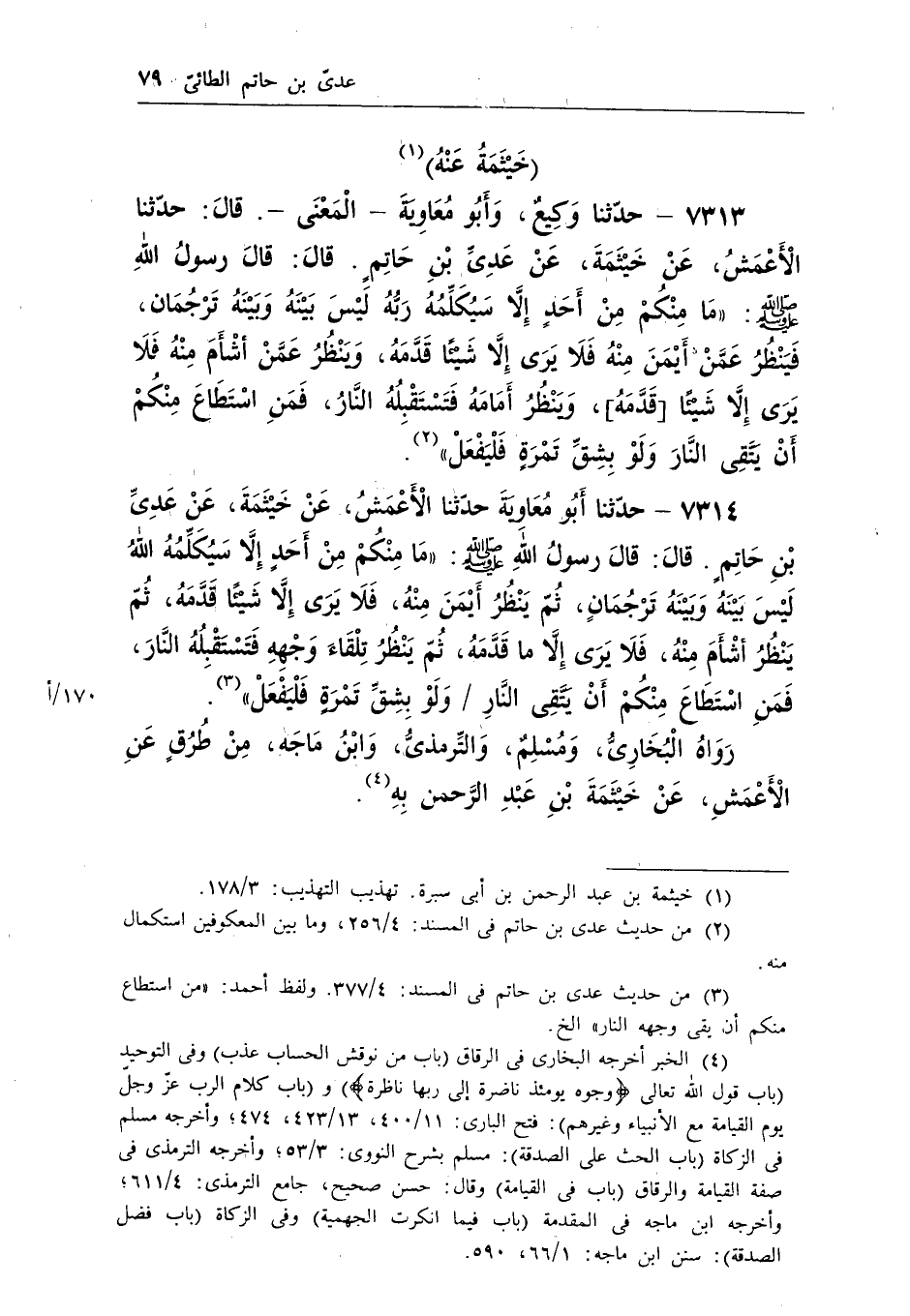7314 - حدثنا أبو معاوية حدثنا الأعمش، عن خيثمة، عن عدى بن حاتم. قال: «مَا مِنْكُمْ مِنْ أَحَدٍ إِلَّا سَيُكَلَّمُهُ اللهُ لَيْسَ بَيْنَهُ تَرْجُمَانٍ، ثُمّ أَيْمَنَ مِنْهُ، فَلاَ يَرَى إِلَّا شَيْئاً قّدَّمَهُ، ثُمّ يَنْظُرُ أشْأَمَ مِنْهُ، فَلاَ يَرَى إِلَّا ما قَدَّمَهُ، ثُمّ يَنْظُرُ تِلْقَاءَ وَجْهِهِ فَتسْتَقْبِلُهُ النَّارَ فَمَنِ اسْتَطَاعَ مِنْكُمْ أَنْ يَتَّقِى النَّارِ/ وَلَوْ بِشِقَّ تَمْرَةٍ فَلْيَفْعَلْ» (¬2) .