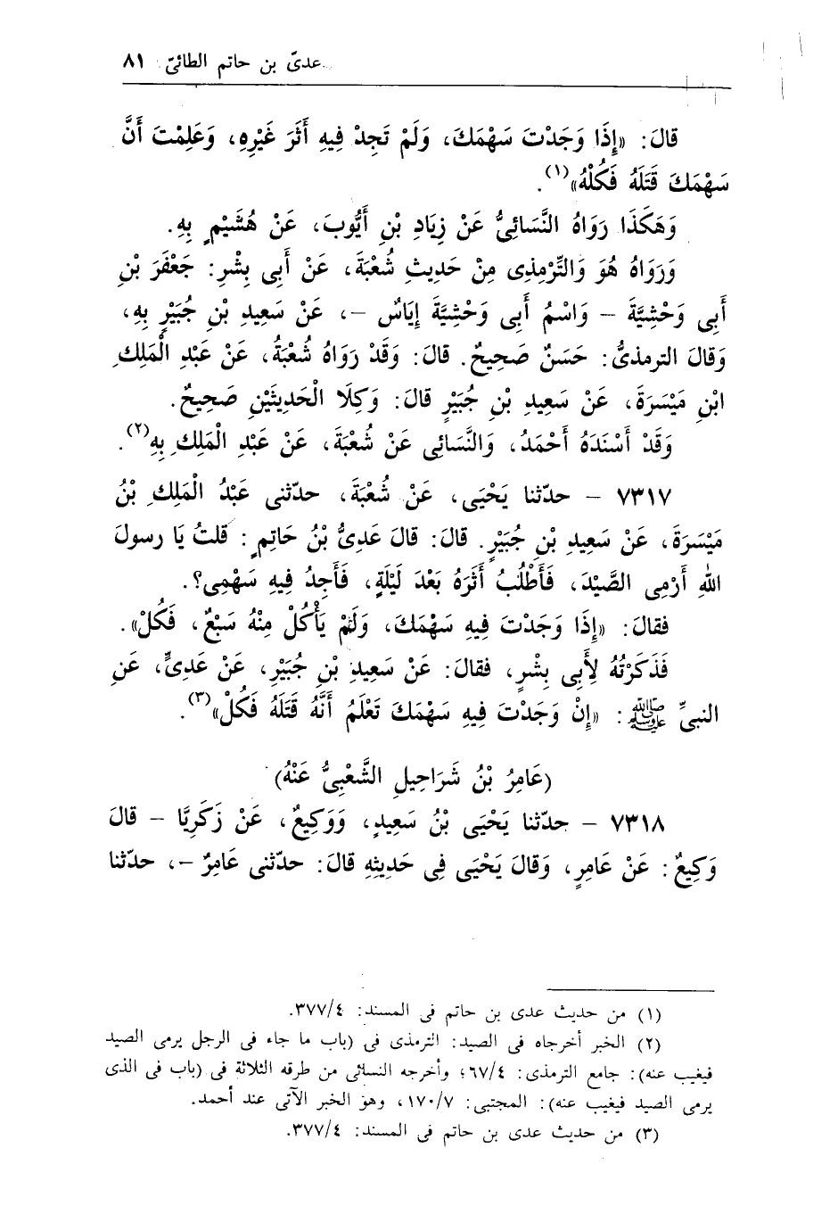 7317 - حدثنا يحيى، عن شعبة، حدثنى عبد الملك بن ميسرة، عن سعيد ابن جبير. قال: قال عدى بن حاتم: قلت يا رسول الله أرمى الصيد، فأطلب أثره بعد ليلة، فأجد فيه سهمى؟.