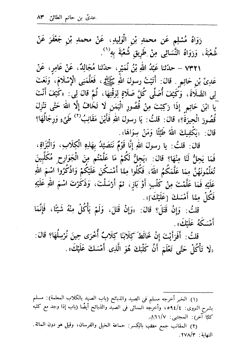 (¬1) الخبر أخرجه مسلم فى الصيد والذبائح (باب الصيد بالكلاب المعلمة) : مسلم بشرح النووى: 4/594؛ وأخرجه النسائى فى الصيد والذبائح أيضا (باب إذا وجد مع كلبه كلبا آخر) : المجتبى: 7/161.
