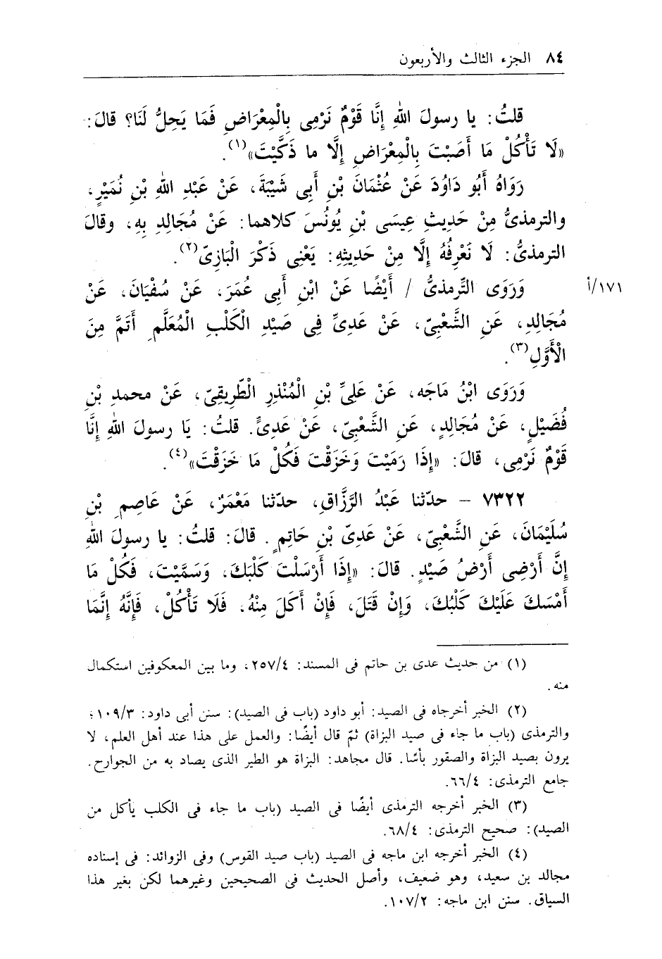 (¬4) الخبر أخرجه ابن ماجه فى الصيد (باب صيد القوس) وفى الزوائد: فى إسناده مجالد بن سعيد، وهو ضعيف، وأصل الحديث في الصحيحين وغيرهما لكن بغير هذا السياق. سنن ابن ماجه: 2/107.