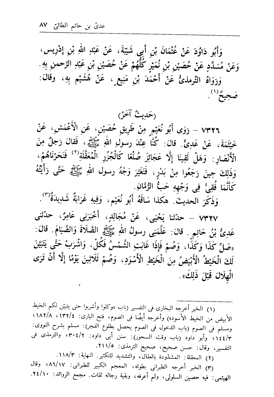 (¬1) الخبر أخرجه البخارى فى التفسير (باب «وكلوا وأشربوا حتى يتبين لكم الخيط الأبيض من الخيط الأسود» ) وأخرجه أيضا فى الصوم، فتح البارى: 4/132، 8/182؛ ومسلم فى الصوم (باب الدخول فى الصوم يحصل بطلوع الفجر) : مسلم بشرح النووى: 3/144؛ وأبو داود (باب وقت السحور) : سنن أبى داود: 2/304؛ والترمذى فى التفسير، وقال: حسن صحيح، صحيح الترمذى: 5/211.