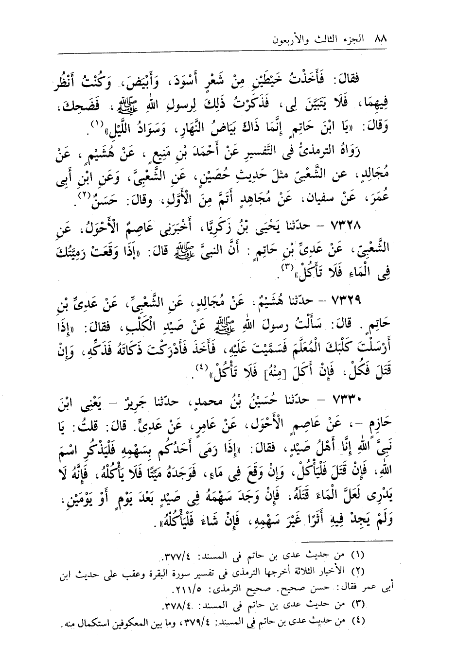 (¬2) من حديث عدى بن حاتم فى المسند: 4/379، وما بين المعكوفين استكمال منه.
