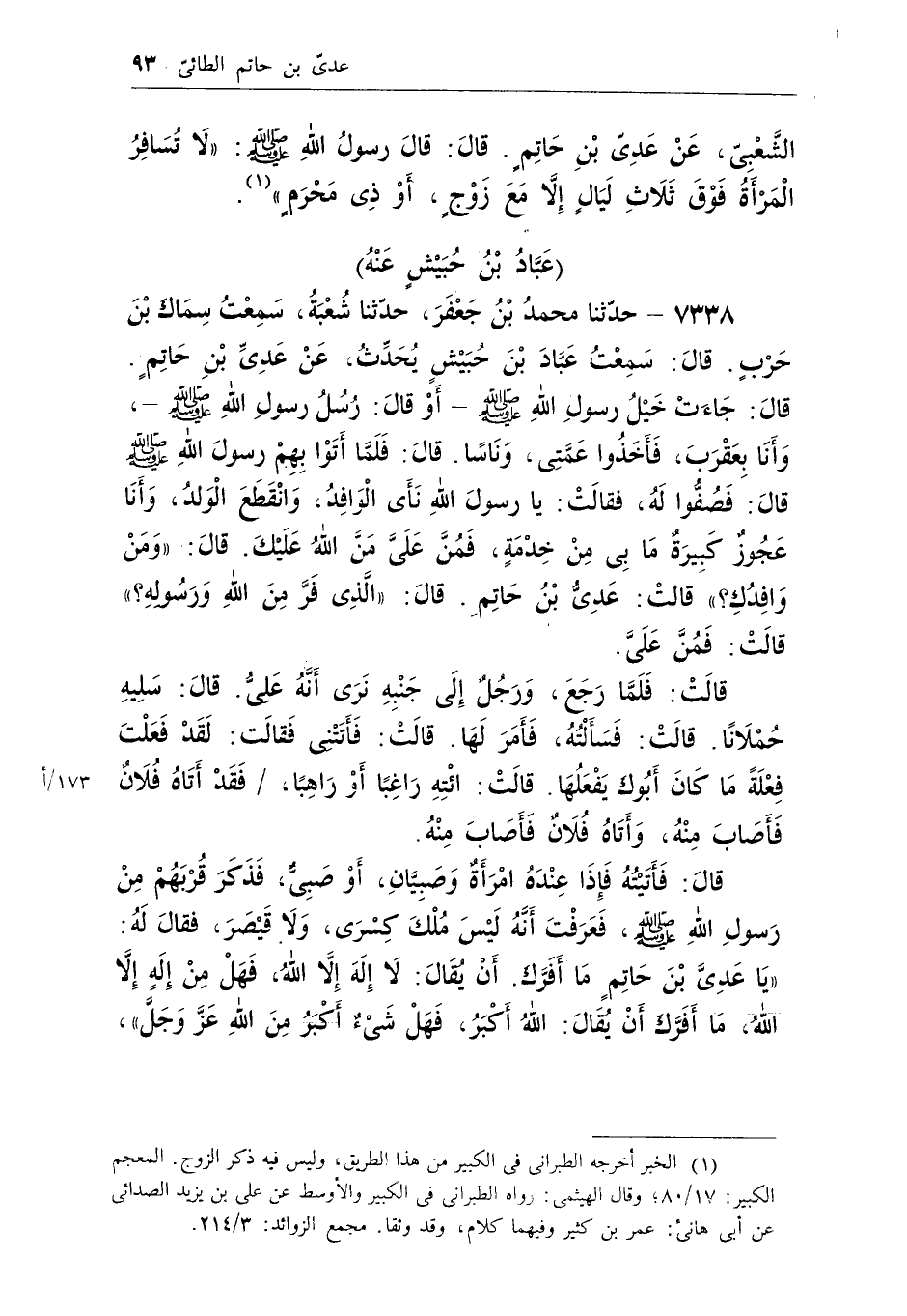 الشعبى، عن عدى بن حاتم. قال: قال رسول الله - صلى الله عليه وسلم -: «لَا تُسَافِرُ المَرْأَةُ فَوْقَ ثَلاَثِ لَيَالٍ إِلاَّ مَعَ زَوْجٍ، أَوْ ذِى مَحْرَمٍ» (¬1)
