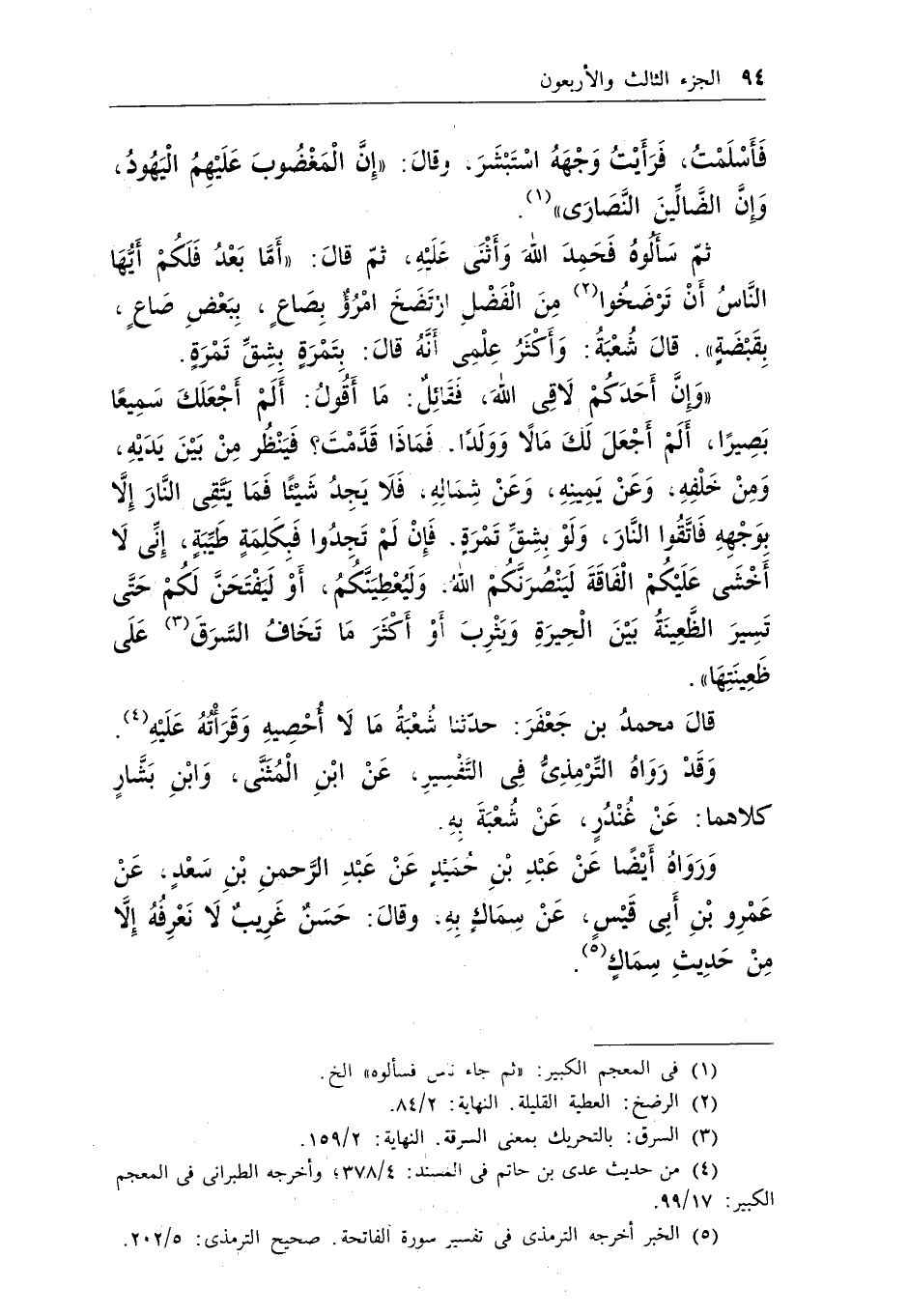 (¬4) من حديث عدى بن حاتم فى المسند: 4/378؛ وأخرجه الطبرانى فى المعجم الكبير: 17/99.