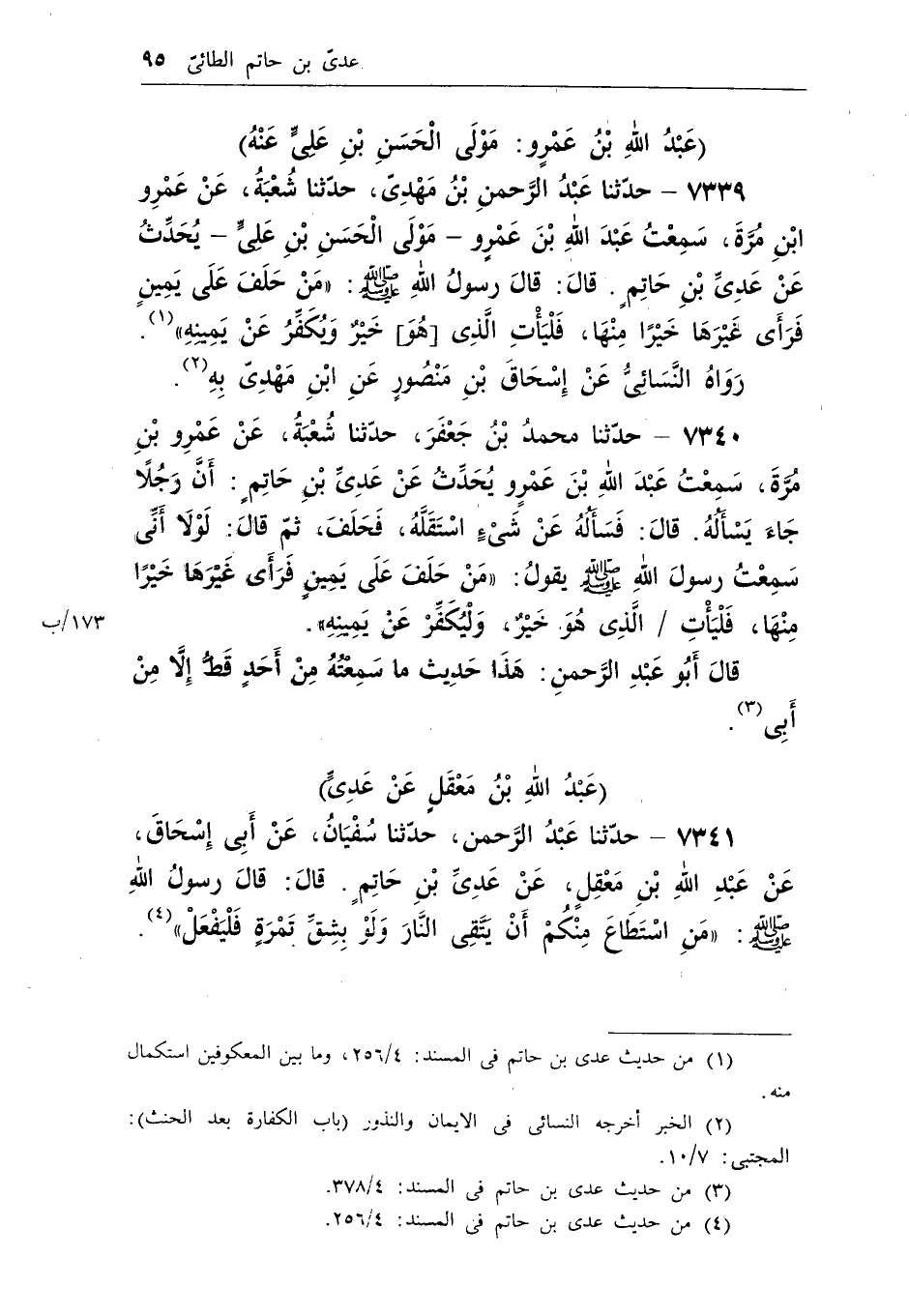 7339 - حدثنا عبد الرحمن بن مهدى، حدثنا شعبة، عن عمرو ابن مرة، سمعت عبد الله بن عمرو- مولى الحسن بن على- يحدث عن عدى بن حاتم. قال: قال رسول الله - صلى الله عليه وسلم -: «مَنْ حَلَفَ عَلَى يَمِينٍ فَرَأَى غَيْرَهَا خَيْراً مِنْهَا، فَلْيَأْتِ الَّذى [هُوَ] خَيْرُ وَيُكَفِّرُ عَنْ يَمِينِهِ» (¬1)