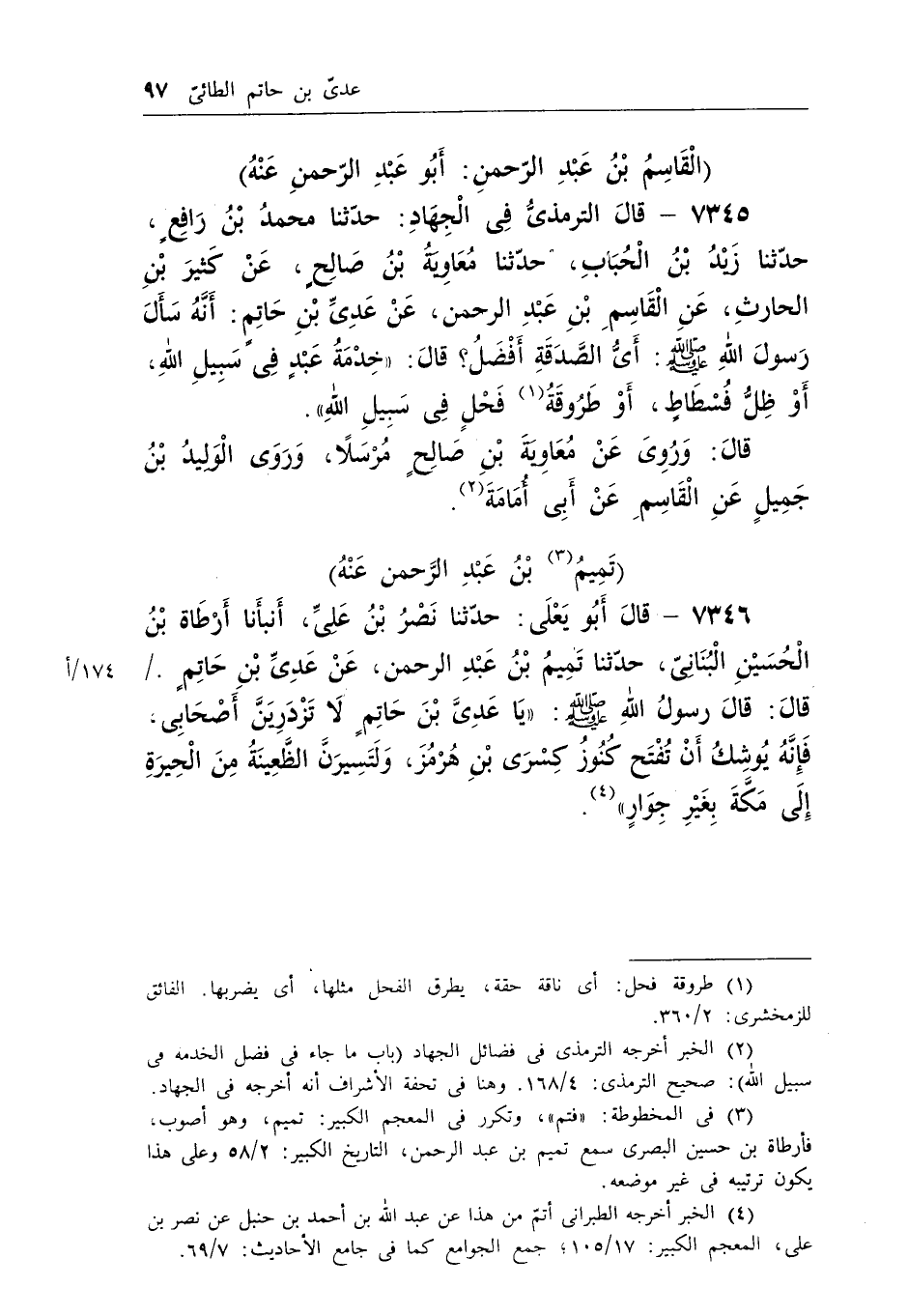 7346 - قال أبو يعلى: حدثنا نصر بن على، أنبانا أرطاة بن الحسين البنانى، حدثنا تميم بن عبد الرحمن، عن عدى بن حاتم. / قال: قال رسول الله - صلى الله عليه وسلم -: «يَا عَدِىَّ ابْنَ حَاتِمٍ لَا تَزْدَرِيَنَّ أَصْحَابِى، فَإْنَّهُ يُوشِكُ أَنْ يَفْتَح كُنُوزُ كِسْرَى بْنِ هُرْمُزَ، وَلَتَسِيرَنَّ الظَّعِينَةُ مِنَ الْحِيرَةِ إِلَى مَكَّةَ بَغَيْرِ جِوَارٍ» (¬4)