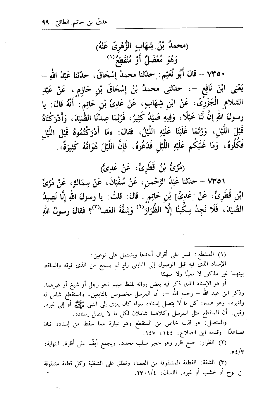 7350 - قال أبو نعيم: حدثنا محمد إسحاق، حدثنا عبد الله- يعنى بن نافع-، حدثنى محمد بن إسحاق بن حازم، عن عبد السلام الجزرى، عن بن شهاب، عن عدى بن حاتم: أنه قال: يا رسول الله إن لنا خيلا، وفيه صيد كثير، فربما صدنا الصيد، وأدركناه قبل الليل، وربما غلبنا عليه الليل، فقال: «مَا أَدْرَكْتُمُوهُ قَبْلَ اللَّيْلِ فَكُلُوهُ، وَمَا غَلَبَكُم عَلَيْهِ اللَّيْلِ فَدَعُوُه، فَإِنَّ اللَّيْلَ هُوَامُّةُ كَثِيرَةٌ» .