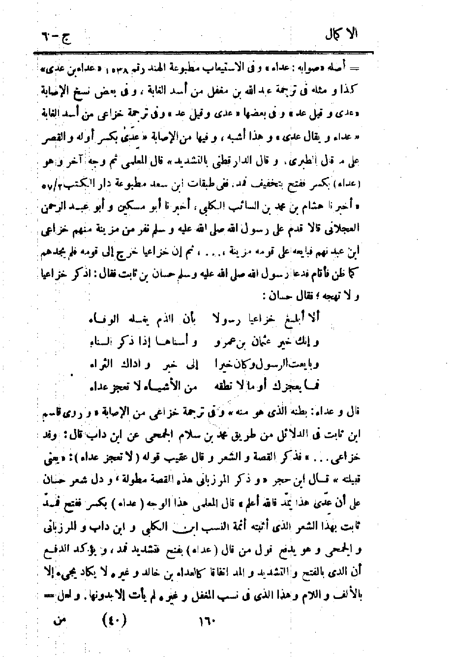 = أصله "صوابه: عداء" وفي الاستيعاب مطبوعة الهند رقم 1538 "عداء بن عدي" كذا ومثله في ترجمة عبد الله بن مغفل من أسد الغابة، وفي بعض نسخ الإصابة "عدي وقيل: عد" وفي بعضها "عدي وقيل: عد" وفي ترجمة خزاعى من أسد الغابة "عداء ويقال: عدي" وهذا أشبه، وفيها من الإصابة "عدى بكسر أوله والقصر على ما قال الطبري، وقال الدارقطني بالتشديد" قال المعلمي: ثم وجه آخر وهو "عداء" بكسر ففتح بتخفيف فمد. ففي طبقات ابن سعد مطبوعة دار الكتب 2/ 57 "أخبرنا هشام بن محمد بن السائب الكلبي، أخبرنا أبو مسكين وأبو عبد الرحمن العجلاني قالا: قدم على رسول الله -صلى الله عليه وسلم- نفر من مزينة منهم خزاعى بن عبد نهم, فبايعه على قومه مزينة.....، ثم إن خزاعيا خرج إلى قومه فلم يجدهم كما ظن فأقام فدعا رسول الله -صلى الله عليه وسلم- حسان بن ثابت فقال: "اذكر خزاعيا ولا تهجه"؛ فقال حسان: