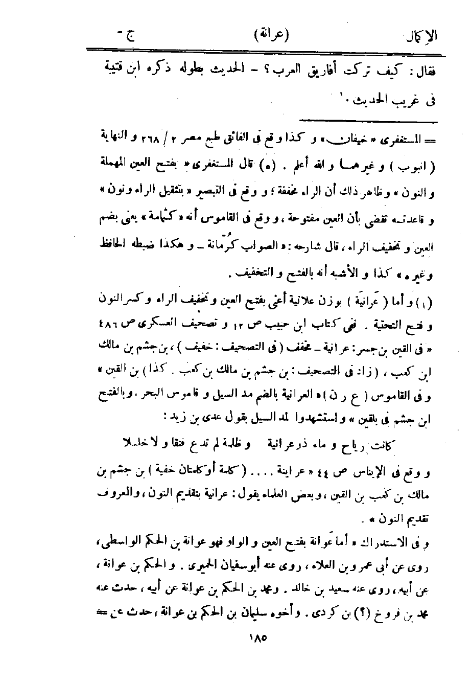1 وأما "عرانية" بوزن علانية أعني بفتح العين وتخفيف الراء وكسر النون وفتح التحتية. ففي كتاب ابن حبيب ص12 وتصحيف العسكري ص486 "في القين بن جسر: عرانية -مخفف "في التصحيف: خفيف"- بن جشم بن مالك بن كعب "زاد في التصحيف: بن جشم بن مالك بن كعب, كذا" بن القين" وفي القاموس "ع ر ن" "العرانية بالضم مد السيل وقاموس البحر, وبالفتح ابن جشم في بلقين" واستشهدوا لمد السيل بقول عدي بن زيد: