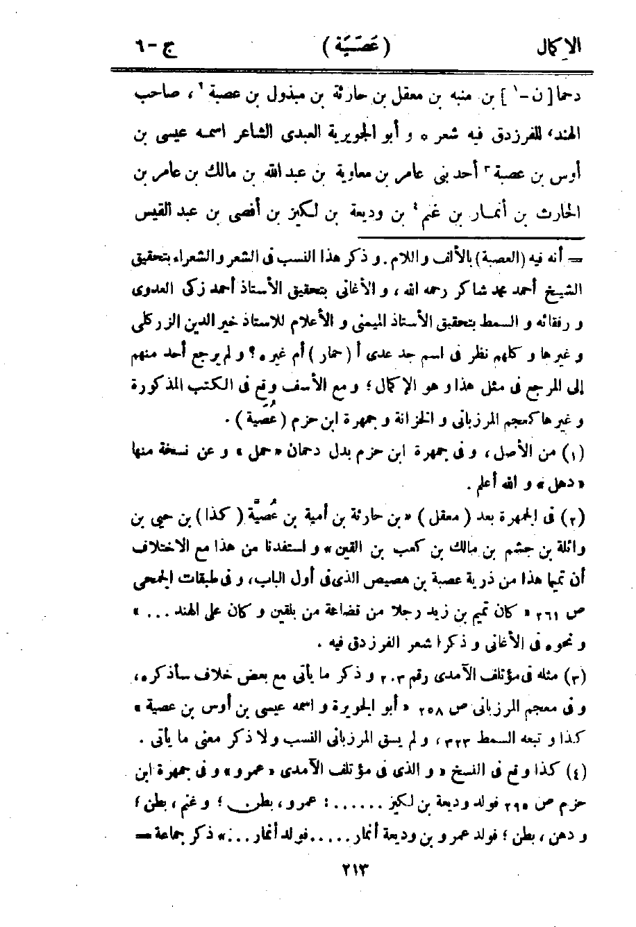 = أنه في "العصبة" بالألف واللام. وذكر هذا النسب في الشعر والشعراء بتحقيق الشيخ أحمد محمد شاكر رحمه الله، والأغاني بتحقيق الأستاذ أحمد زكي العدوي ورفقائه والسمط بتحقيق الأستاذ الميمني والأعلام للأستاذ خير الدين الزركلي وغيرها, وكلهم نظر في اسم جد عدي أ"حمار" أم غيره؟ ولم يرجع أحد منهم إلى المرجع في مثل هذا وهو الإكمال؛ ومع الأسف وقع في الكتب المذكورة وغيرها كمعجم المرزباني والخزانة وجمهرة ابن حزم "عصية".
