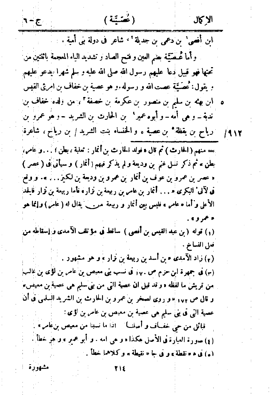 وأما عصية بضم العين وفتح الصاد وتشديد الياء المعجمة باثنتين من تحتها فهو قبيل دعا عليهم رسول الله -صلى الله عليه وسلم- شهرا, يدعو عليهم ويقول: "عصية عصت الله ورسوله". وهو عصية بن خفاف بن امرئ القيس بن بهثة بن سليم بن منصور بن عكرمة بن خصفة3، من ولده خفاف ابن ندبة -وهي أمه- وأبوه عمير4 بن الحارث بن الشريد, وهو عمرو بن رياح بن يقظة5 بن عصية, والخنساء بنت الشريد بن رياح، شاعرة