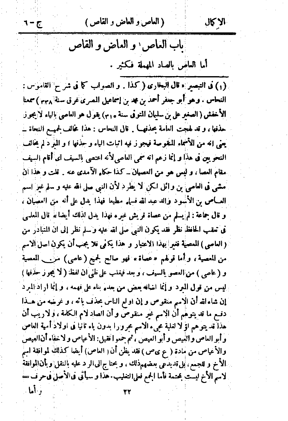 1 في التبصير "قال البخاري "كذا, والصواب كما في شرح القاموس: النحاس, وهو أبو جعفر أحمد بن محمد بن إسماعيل المصري غرق سنة 338" سمعنا الأخفش "الصغير علي بن سليمان المتوفى سنة 315" يقول: هو العاصي بالياء لا يجوز حذفها، وقد لهجت العامة بحذفها. قال النحاس: هذا مخالف لجميع النحاة, يعني أنه من الأسماء المنقوصة فيجوز فيه إثبات الياء وحذفها، والمبرد لم يخالف النحويين في هذا وإنما زعم أنه سمي العاصي لأنه اعتصى بالسيف أي: أقام السيف مقام العصا، وليس هو من العصيان, كذا حكاه الآمدي عنه. قلت: وهذا إن مشى في العاصي بن وائل لكن لا يطرد؛ لأن النبي -صلى الله عليه وسلم- غير اسم العاص بن الأسود والد عبد الله فسماه مطيعًا فهذا يدل على أنه من العصيان، وقال جماعة: لم يسلم من عصاة قريش غيره, فهذا يدل لذلك أيضًا" قال المعلمي: في تعقب الحافظ نظر, فقد يكون النبي -صلى الله عليه وسلم- نظر إلى أن المتبادر من "العاصي" المعصية فغير بهذا الاعتبار وهذا يكفي فلا يجب أن يكون أصل الاسم من المعصية، وأما قولهم "عصاة" فهو صالح لجميع "عاصي" من المعصية و"عاصي" من العصو بالسيف، وبعد فيغلب على ظني أن لفظ "لا يجوز حذفها" ليس من قول المبرد وإنما أضافه بعض من بعده بناء على فهمه، وإنما أراد المبرد إن شاء الله أن الاسم منقوص وإن أولع الناس بحذف يائه، وغرضه من هذا دفع ما قد يتوهم أن الاسم غير منقوص وأن الصاد لام الكلمة، ولا ريب أن هذا قد يتوهم أولا لغلبة مجيء الاسم مجرورا بدون ياء, ثانيا في أولاد أمية العاص وأبو العاص والعيص وأبو العيص، ثم جمعوا فقيل: الأعياص ولا خفاء أن العيص والأعياص من مادة "ع ي ص" فقد يظن أن "العاص" أيضا كذلك لموافقة اسم الأخ وللجمع، بل قد يدعي بعضهم ذلك، ويحتاج إلى الرد عليه بالنقل وبأن الموافقة لاسم الأخ ليست بمحتمة, فأما الجمع فعلى التغليب. هذا وسيأتي في الأصل في حرف الفاء "باب الفامي والقاضي والعاصي" وذكر هناك العاصي بن عمرو -أو عمر- الطفاوي.
