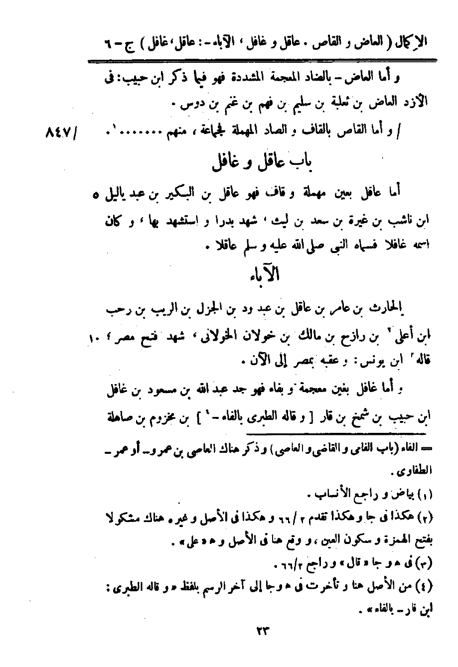 أما عاقل بعين مهملة وقاف فهو عاقل بن البكير بن عبد ياليل بن ناشب بن غيرة بن سعد بن ليث، شهد بدرا واستشهد بها، وكان اسمه غافلا فسماه النبي -صلى الله عليه وسلم- عاقلا.